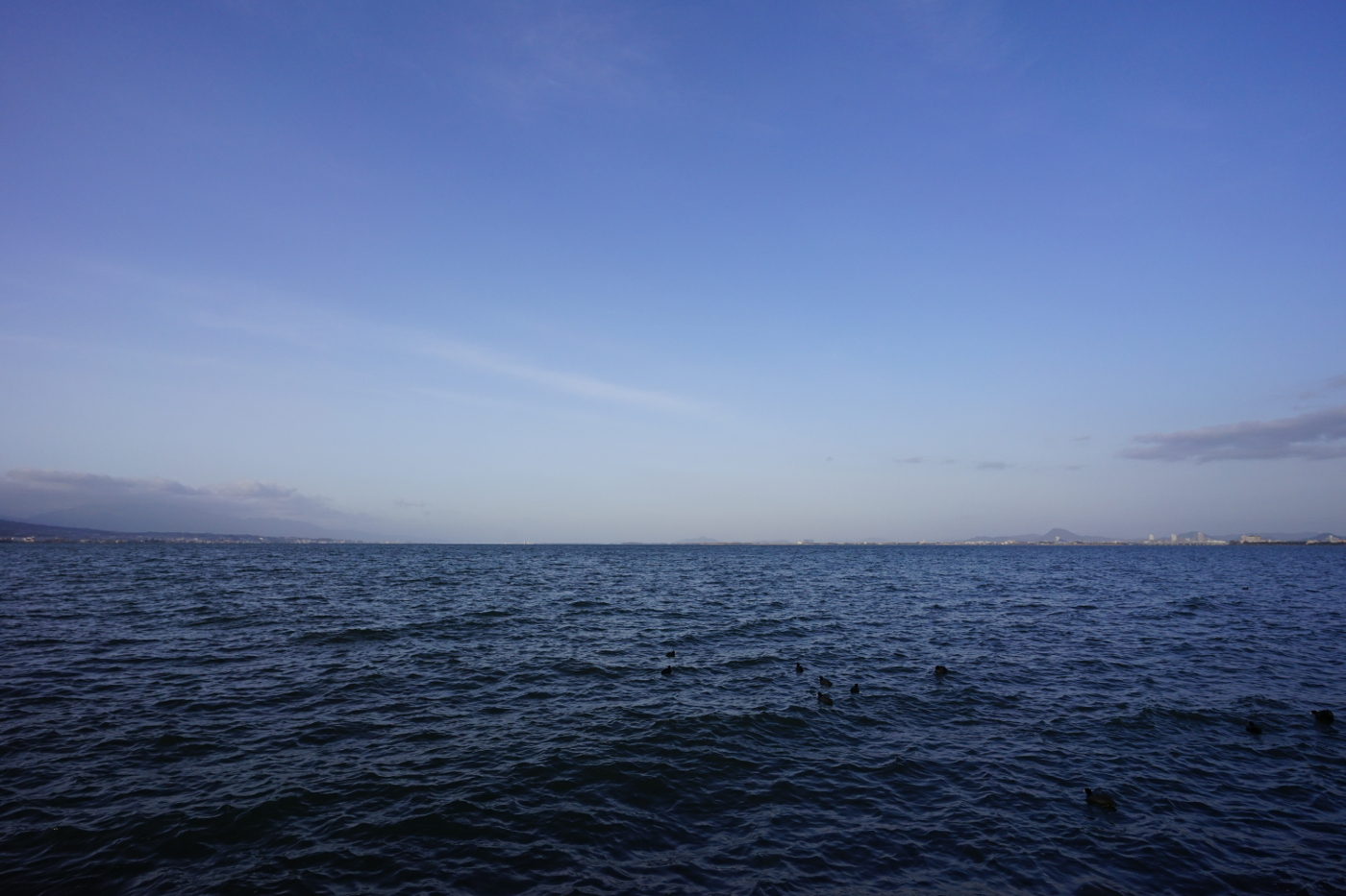 写真は今日の琵琶湖と昨日撮った、オカメザクラと白梅です。