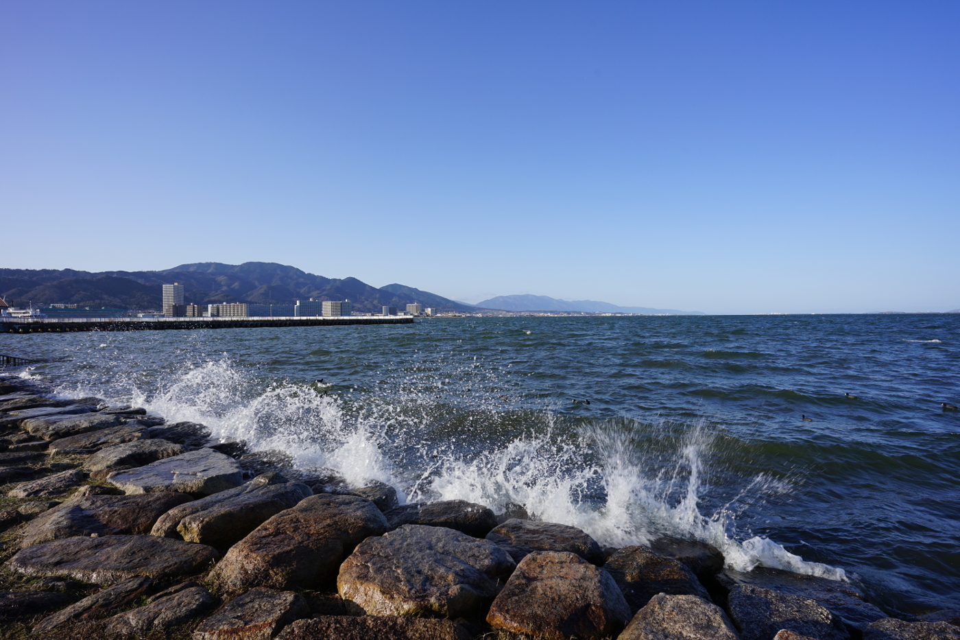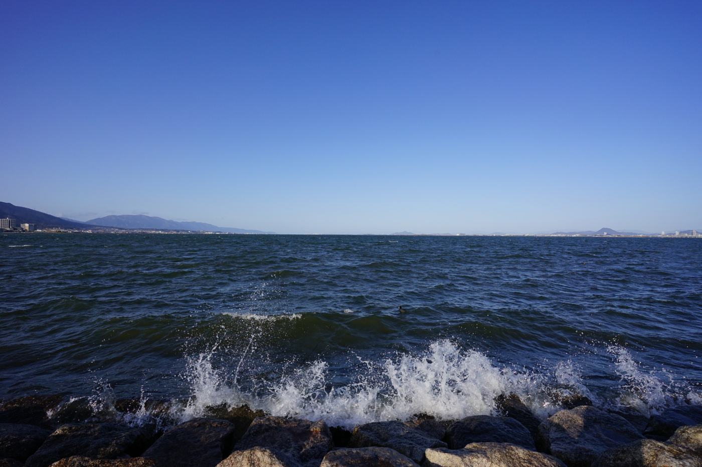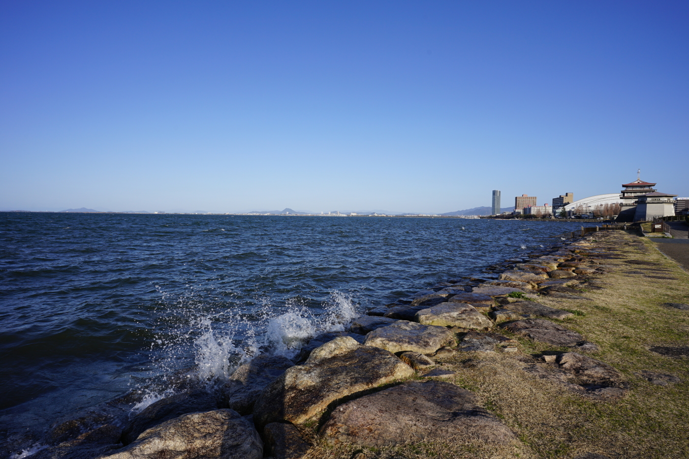 昨日は琵琶湖を見ること出来なかった。やはり一日一回は琵琶湖を見ないと心が落ち着かないと湖岸ポタリングに出かけた。午後4時でも明るく太陽は西方で春の陽射し届けて来れ、浜大津港の突堤が白く輝いていた。湖岸に佇んで琵琶湖の北方を眺めると心が騒ぎ、彼方の原発群が心配になる、どうか老朽原発の再稼働だけでも止めてほしいと波立つ琵琶湖を眺めながら事故の起きないことを願った。