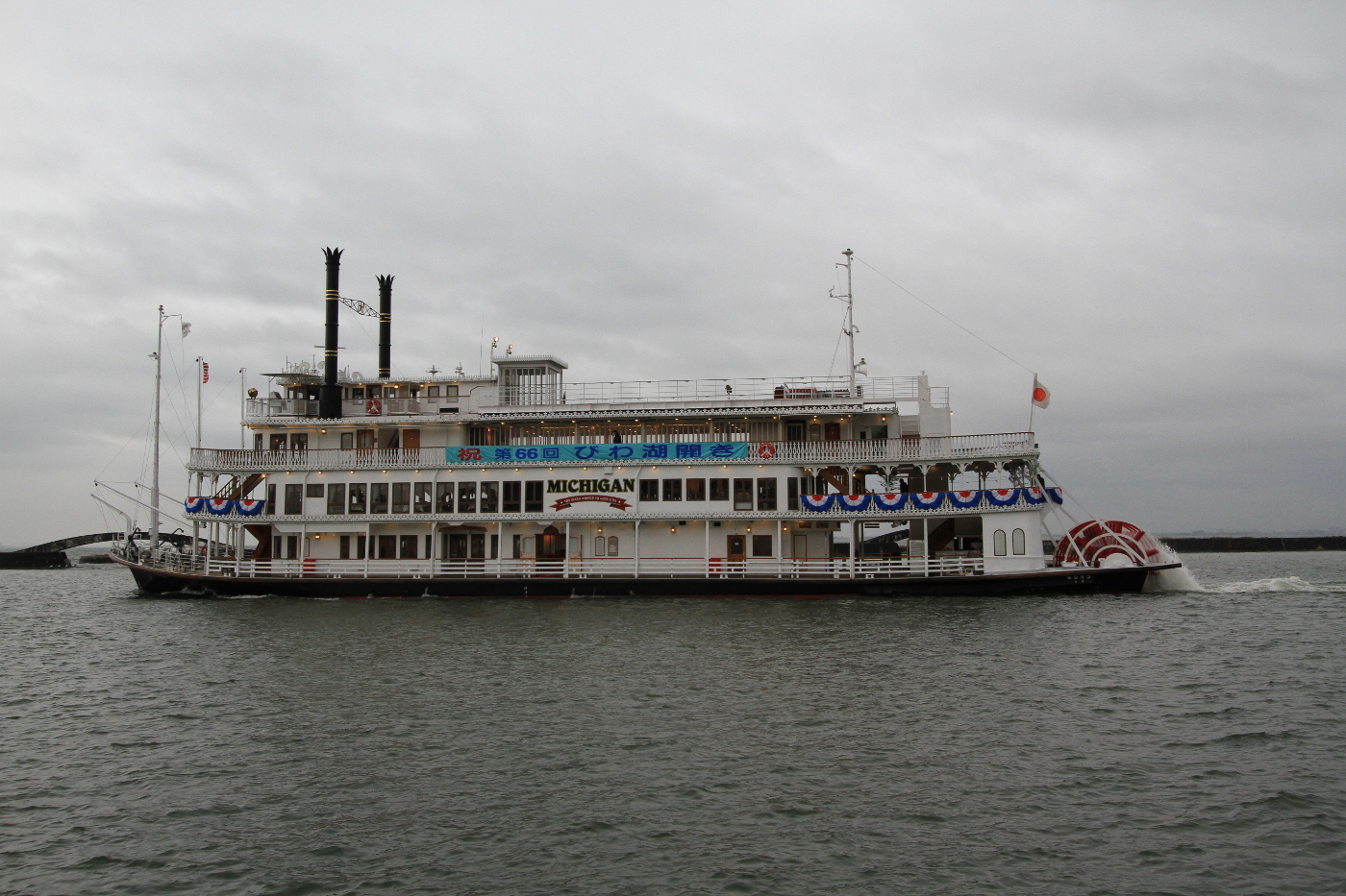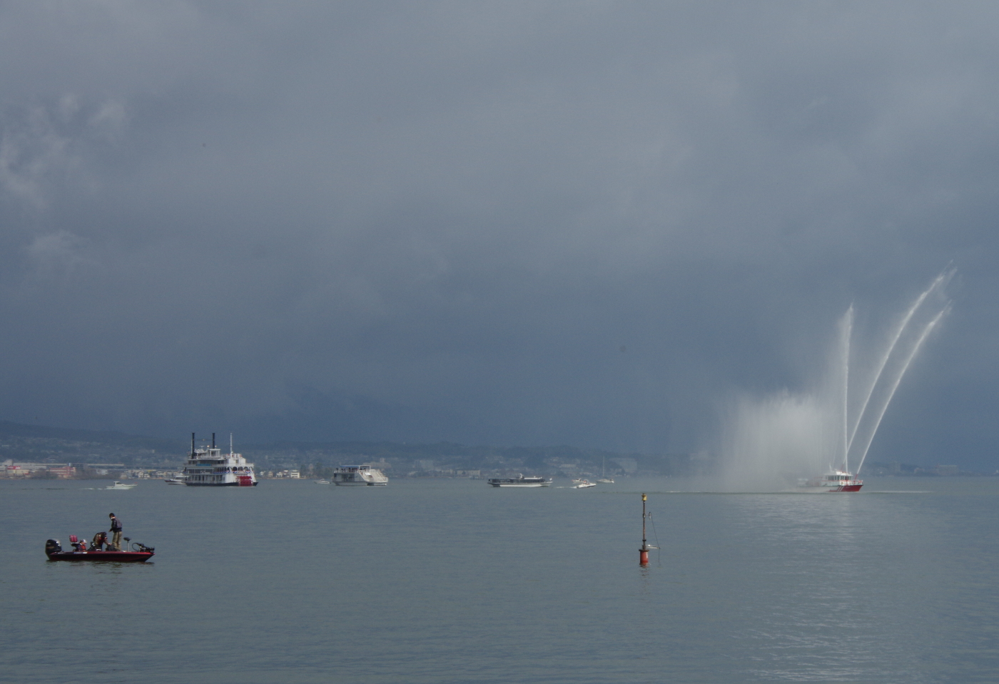 びわ湖の春を告げる行事、びわ湖開きが今日行われた。三井寺の展望台へ向かう途中ヘリの音が聞こえた。びわ湖開きの取材で飛来したのかと空を見上げた。帰宅後、湖岸へ向かうと既にミシガン号は湖上に、そして数隻の観光船が見えた。突堤から様子を撮影する事に决め自転車を突堤の先で止めた。消防艇が放水が花を添えていた、と言っても広い湖上では少し寂しさも感じた。上空のヘリ、四機ほどがミシガン号から湖面に投げられる黄金の鍵を取材するため旋回していた。コロナ禍では観光も期待できないのではと琵琶湖を見ていると、僕はどうしても琵琶湖の北方の若狭の原発が気になる、高浜原発一号二号機そして美浜の老朽原発が再稼働して、もし事故が起きれば、琵琶湖の水が汚染され近畿1400万人の命の水が失われ大変な事態になることは誰もが分かっている筈だ。世界の動きはコロナ禍の中で地球環境の見直しで、自然エネルギーへの転換が主になっているが、日本は原子力回帰へと舵を切っているのは狂気の沙汰としか思えない、3月11日が来れば福島第一原発事故の10周年だ、事故の終息が見えない中で、放射能汚染物質は溜まるばかりだ。未来を生きる人のためにも老朽原発の再稼働はさせてはならないと琵琶湖の北方を見た。