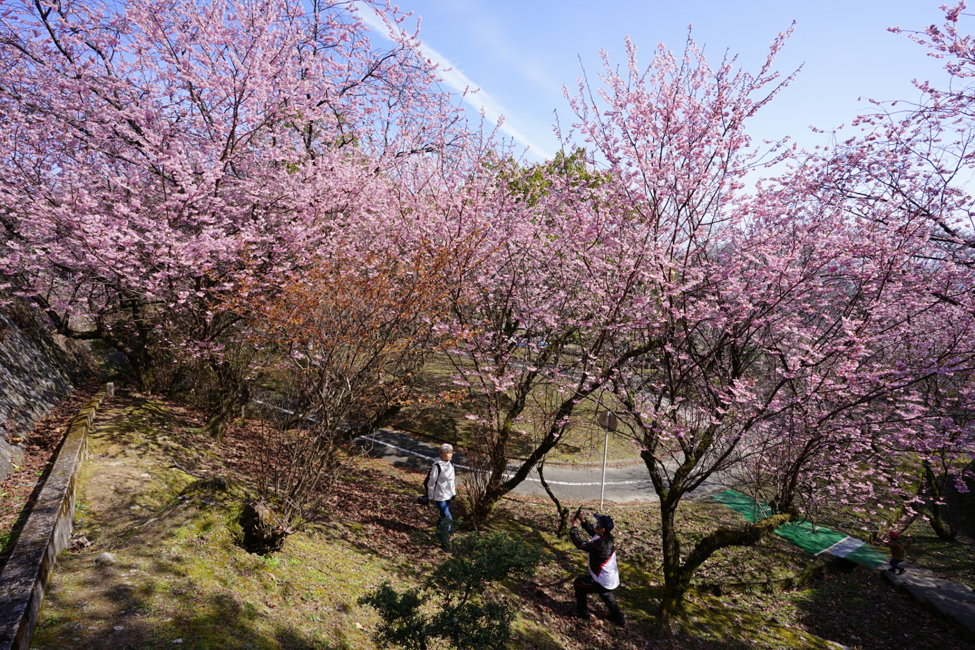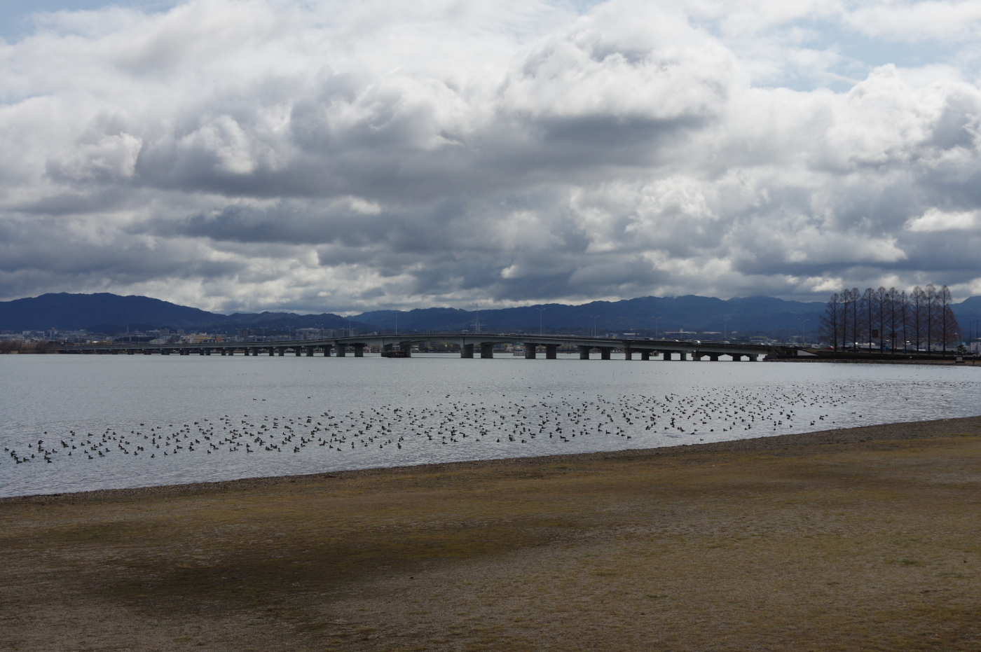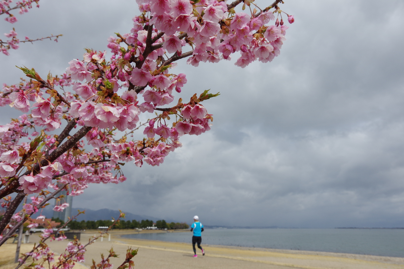 膳所由美浜の河津桜は満開を向かえ、湖上では水鳥が帰還のために集合していた。