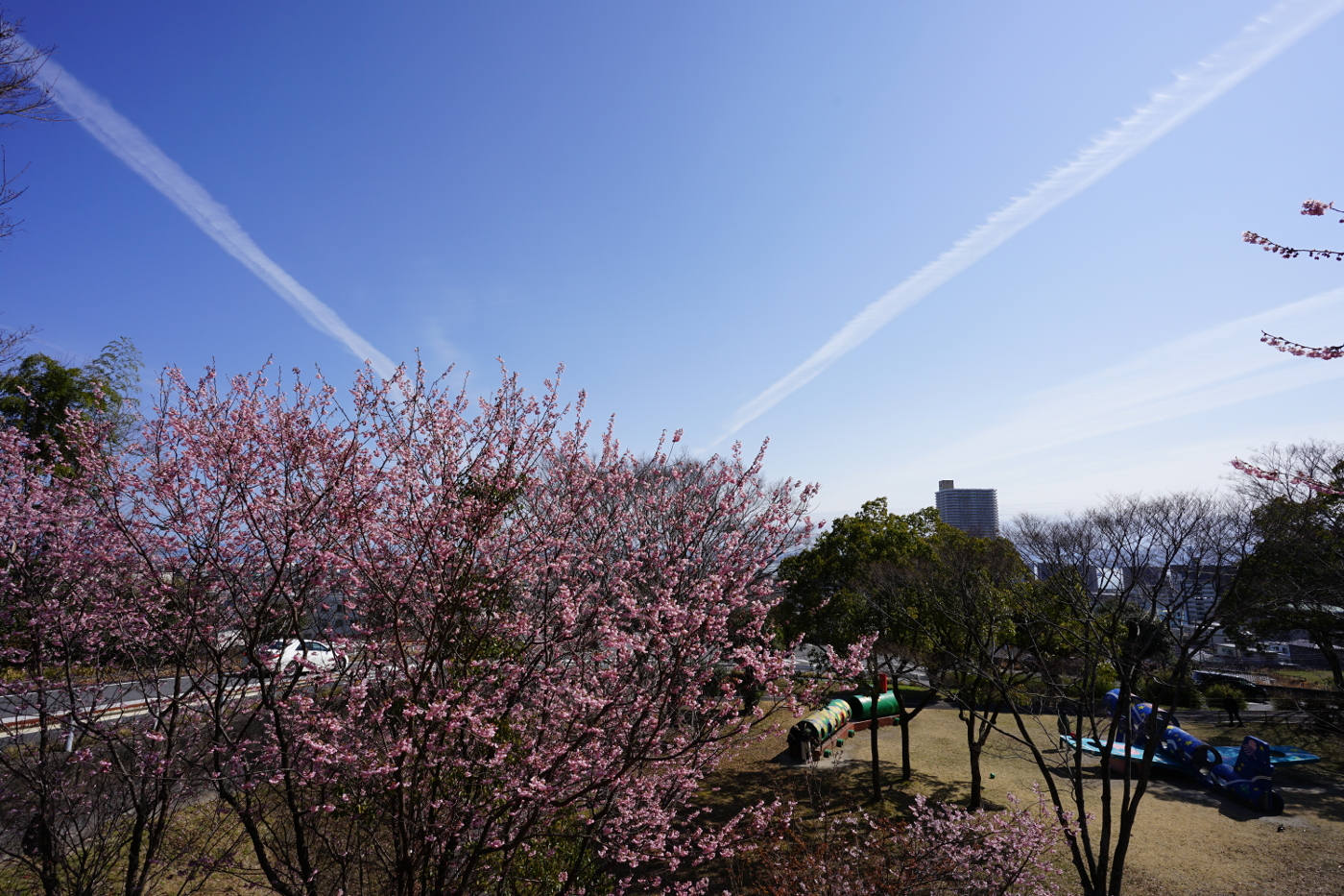 お花見と言えば桜だ、でもソメイヨシノが咲き始めないと多くの人は、お花見には出かけないようだ。桜花の下で宴会をするのがお花見と言う事が成立するのが此の国の常識だがコロナ禍で、去年は、お花見も自由に出来なかったが、今年は出来るといいね、とおもった。今日は皇子が丘公園のハツミヨザクラが満開になった頃ではと出かけた。公園の坂道は急で自転車を降りた。電動自転車なら花の咲いているところまで上がれるがと、少し息を切らせながら自転車を押した。早咲きの名所として知られているのか思ったより多くに人が花を愛で楽しんでいた。デジカメを出し構図をと、空を見ると飛行機雲がVサインをしてくれた。でもお天気は下り坂ではVサインも空しいと下方を見るとコンクリートの遊具飛行機が恨めしそうに空を見ていた。自転車に乗り少し下ると梅花の香りが以前にもまして強く感じ、白梅の咲く方に行くと此方も満開で桜花と競っているようだ。馬酔木の花も負けじと輝いていた。自転車を押し上げたお陰で帰路は重力エンジン?でブレーキを握るだけの省エネだ。ついでに湖岸へ向った。今日から観光船ミシガン号が運行が始まり、沖合に見えた。打出浜から琵琶湖と青空の雲を見ると何となく桜という字に似ているように感じて写真に撮った。青空にメッセージを描く航空会社もあり、飛行機からコンピュターで制御された、白煙を出して大空に描く文字は映画でも見たことがある、でも飛行機は見当たらないから雲が描いたのではと又青空を見た。疎水の傍らではオカメザクラも花を咲かせていた。もう春は本番では・・・