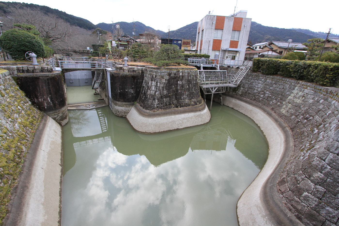 毎日の散歩で必ず京都疎水に架かる鹿関橋からトンネルへ向かう疎水の流れを見るが、今、点検と清掃のために水が止められていて僅かばかりの水が細い一本の流れを作って京都へ向っていた。京都への飲水は第二疎水から取水されるので水道水らは大丈夫だ。大津では明治時代の面影を残す唯一の場所だ。今日は北国橋から閘門の写真を撮った。三保が崎の揚水機場から取り込まれた琵琶湖の流れは此の鹿関?閘門で水流は二つに別れ、そして閘門を通らずに迂回させられた水流は一本の川になって京都へ向かう、閘門には扉が間隔をあけて二つ設置されているのは水流を調節するために迂回させた流れとの段差を克服して船を安全に本流に浮かせるための閘門だ。パナマ運河の様な仕組みといってもスケールは小さいが見事な閘門だと思った。疎水の通船を琵琶湖浜大津港から運行する時は、この閘門の第一扉と第二扉の間に通船を入れ水位の調節をしてから迂回させた本流に通船を送り出す仕組みだが、閘門は人力で水門扉の開閉は大変な時間がかかりそうだ。数十年前は閘門の上には監視小屋があったが今は木が植えられているだけだ。今年の春の通船は始まるのかと閘門を写真に撮った。