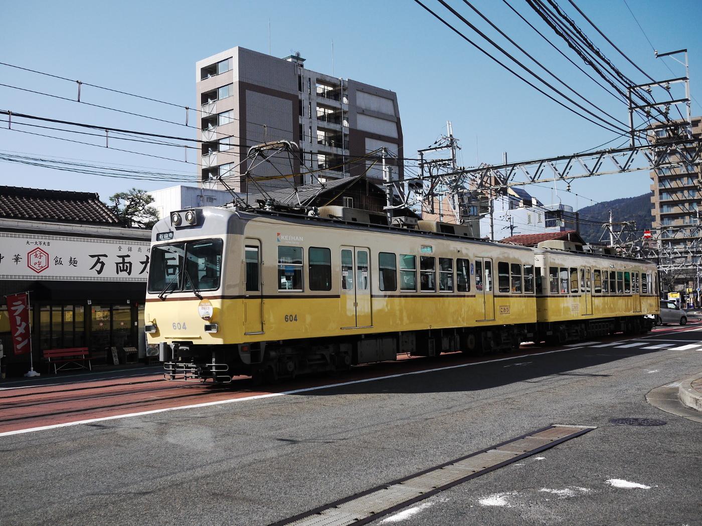 京阪電車のびわこ浜大津駅周辺では電車を撮影する、所謂、撮り鉄をよく見かける、路面を走るラッピングされた電車を撮るのが目的の様だ。そして去年9月に600形に昔走っていた、びわこ号の塗装をした記念号も人気だ。僕もチャンスがあればと狙っていたが、今日、自分の狙った場所に居合わせ、やっと撮ることが出来た。良く電車を見ると僕の小学生の頃、流線型でカッコの良いびわこ号は絵に描いた記憶があり、塗装された、記念号の、びわこ号は似ているが姿は別物と思いながら見送った。本物の、びわこ号は二車両三台車だ、塗装された記念号は四台車ではと、家に帰り、パソコンで昔の、びわこ号を調べた。パソコンの写真を見ていると僕の記憶の中でも映像が蘇ってきた。パンタグラフは中央にあり、ポールが着いた車両で、連結部分は円筒形の金属製で、今のような蛇腹ではなかった。そして1970年に最終電車が走ったと記してあり、僕も二十代に本物の、びわこ号に乗車したことをおもいだした。そして連結部を写真に撮った憶えもあるのだがネガの存在が不明だと少し残念におもった。飛行機に夢中になっていた所為で江若鉄道や京阪電車をもっと撮っておけばよかったと少し悔やんだ。