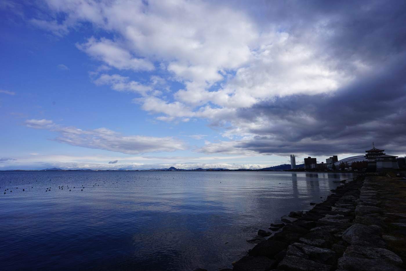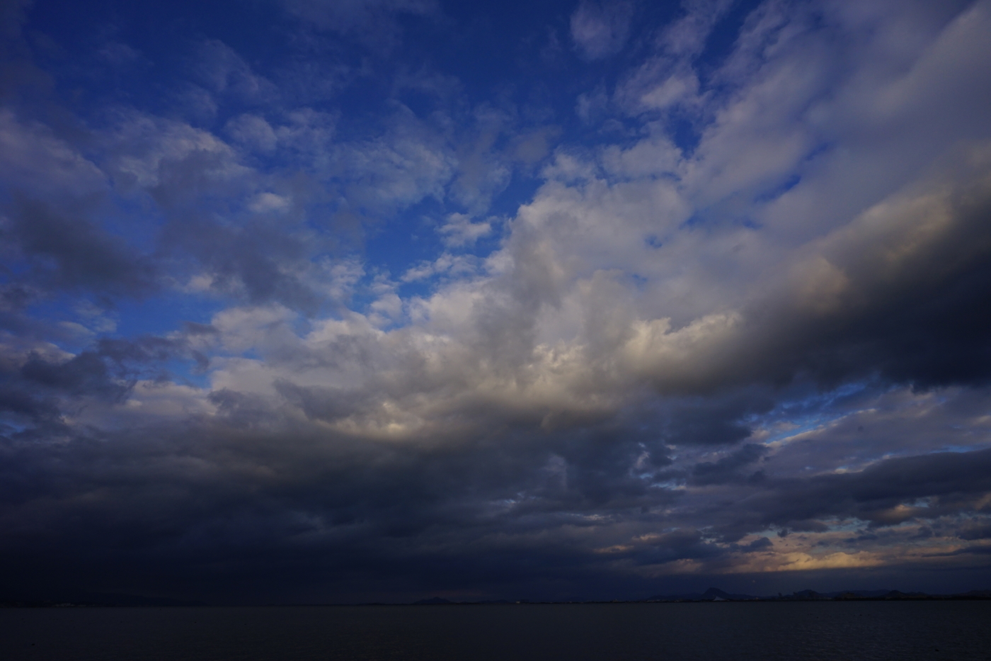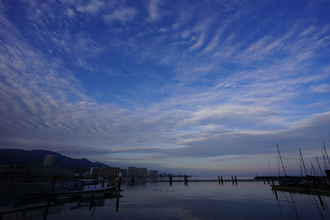 夕方、浜大津港で三十分ほど空の変化を楽しんだ。上空の雲が移動する速さに驚いた。僕が二百メートル移動する間に天空の様子がすっかり変化しているのに驚いた。大空にエアーブラシで大きな雲を描けるのは気流を自由に扱える天才が空に住んでいるのではと思いながら写真を撮った。