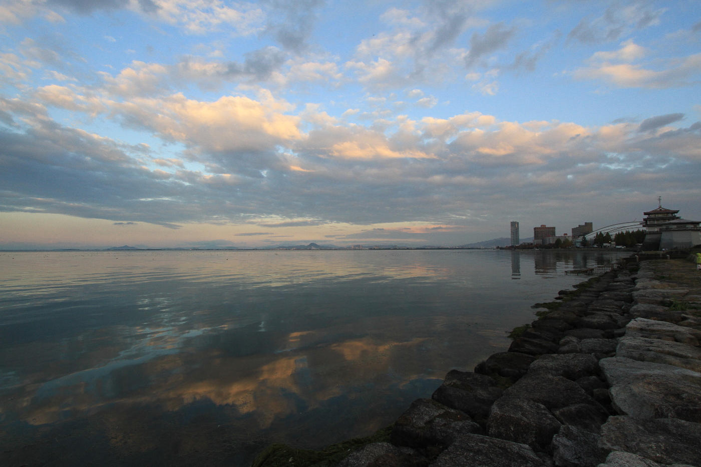 理髪店の帰り道、空を見上げると美しい雲が誘っているように見えた。時刻は4時半、今なら琵琶湖の夕景に間に合うと自転車を出し湖岸へ向った。浜大津港に着き湖面を見ると鏡の様な水面に赤く染まった雲が映って空よりも美しく思った。そして打出浜湖岸から暮れなずむ琵琶湖の美しさに暫し見とれながら、此の美しさを言葉で表現するなら、と考えるも浮かぶ筈がないとデジカメのシャッターを押した。写真も良いが言葉で表現される美しさは想像の世界だと、読んでいる小説「百年の散歩」多和田葉子さんの小説だ。内容はドイツのベルリンの街の通りを題材にして百年の時を見事な言葉で現代と過去を行き来しながら人間社会の悲しさや楽しさを語る小説を間もなく読み終えるが、少し不思議な事に、此の小説に関連した映画を今週に見たからだ。「異端の鳥」もナチスが絡むユダヤ人の悲劇だ、そして昨日見た「ある画家の数奇な運命」もナチスの優勢種保存の人種隔離の問題を描いた映画と繋がっていた。小説「百年の散歩」の中で語られるドイツのナチス時代の記憶が物語の中で彷徨っていて、歴史の消えることのない汚点を思い出させてくれる、何時になったら、平和な社会が来るのかと、そして我が国でも百年の散歩をしながら過去の苦い記憶を呼び起こさねば前には進めないのではと考える日になった。