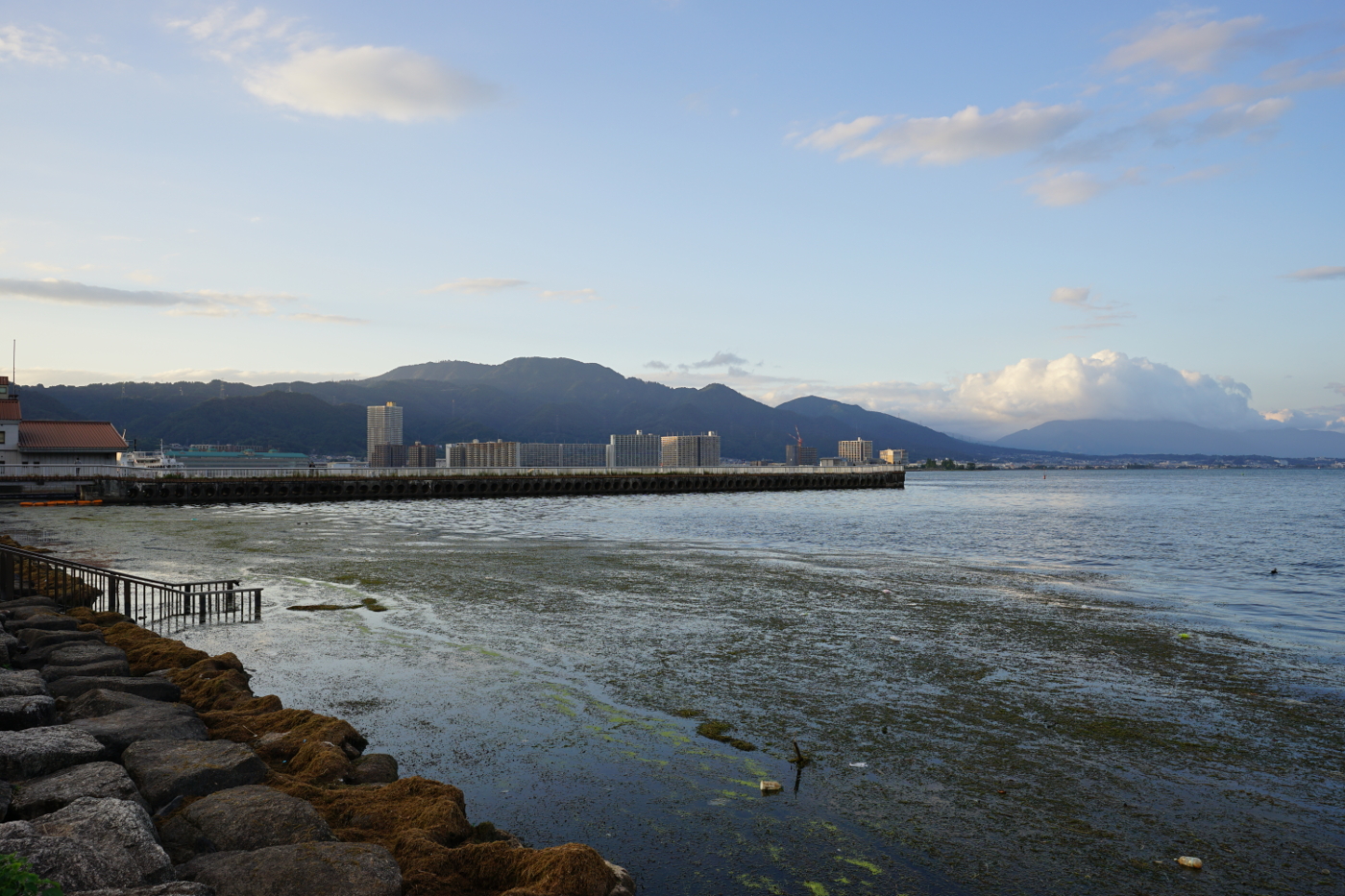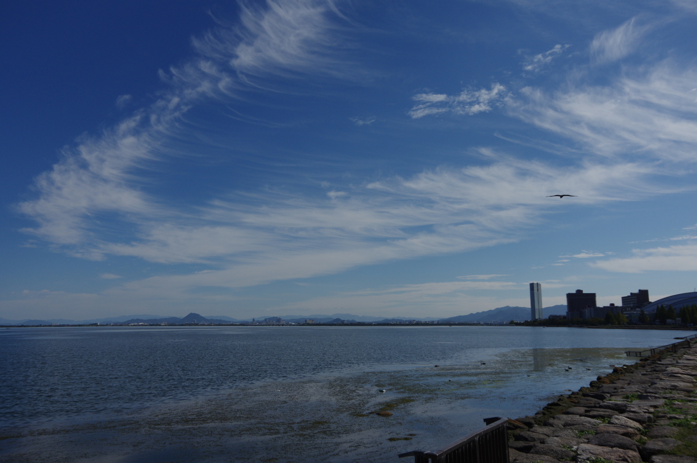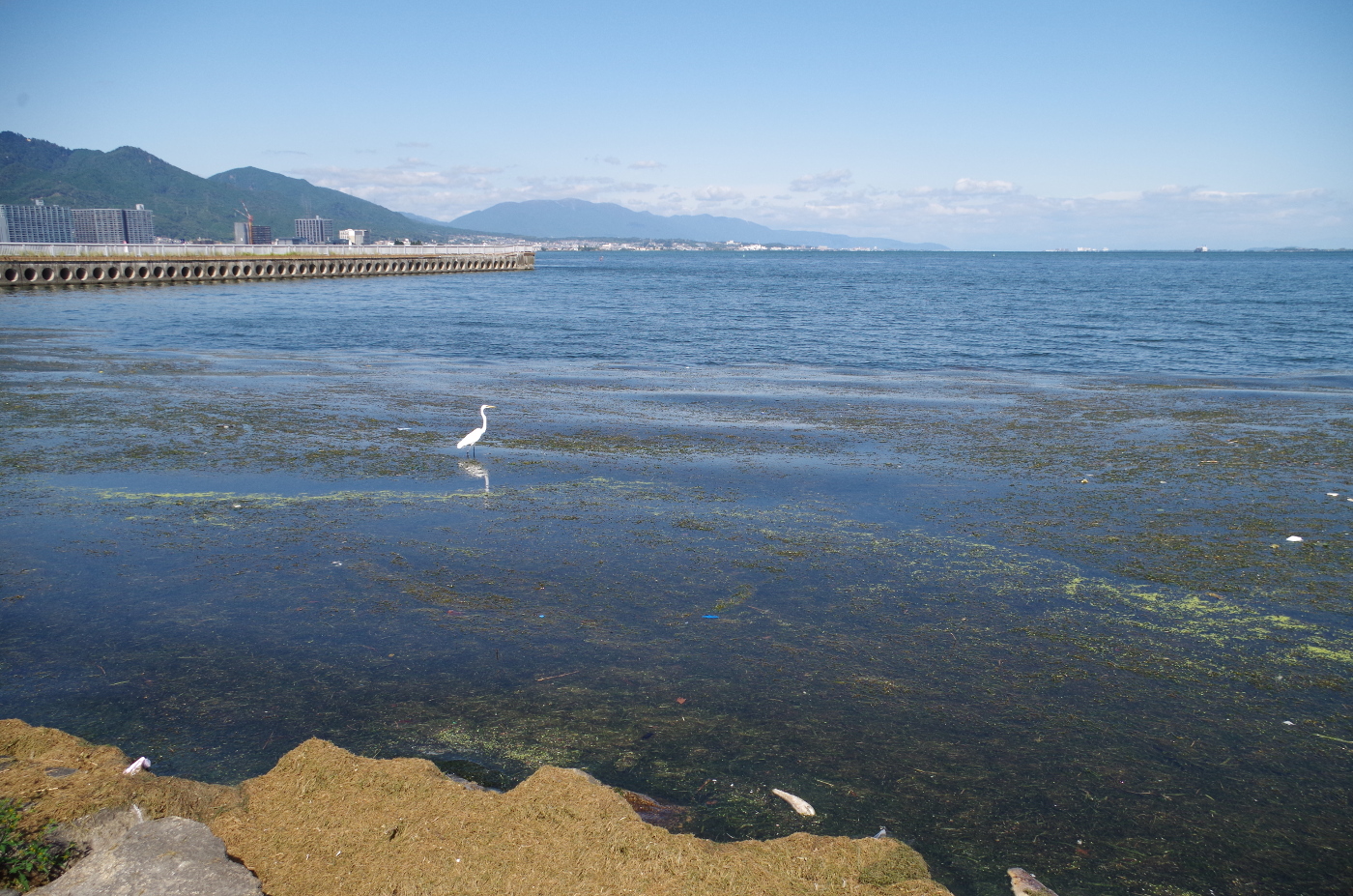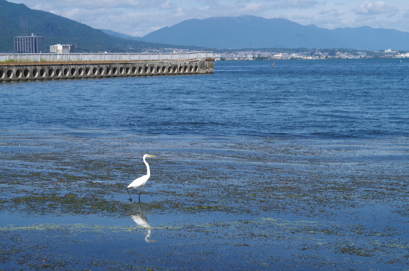 今日も好天となった。最近、パソコンでの写真データー探しに追われ、思う写真が見つからず作業も進まない、アナログなら物(ネガやポジ)を探す作業の方が良いとおもいながら便利になったと錯覚しているデジタル時代は本当にこれからも役立つだろうかと疑問を感じた。明日はポジフイルムを探そうとパソコンでの作業を諦めた。そして湖岸ポタリングへと出かけた。浜大津港の湖岸から湖上を見るとアオサギとシラサギが小さな藻群の上で餌探しをしていた。デジカメを構えるとシラサギは飛び去った。何時ものカフェ、タイムでコーヒーブレイクを済ませ帰り道、湖岸を見るとシラサギが藻の上で狩りをしていた。今回はカメラを向けても逃げなかった。
