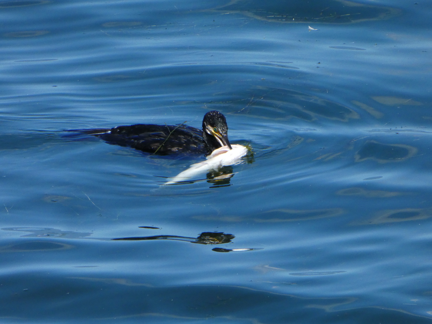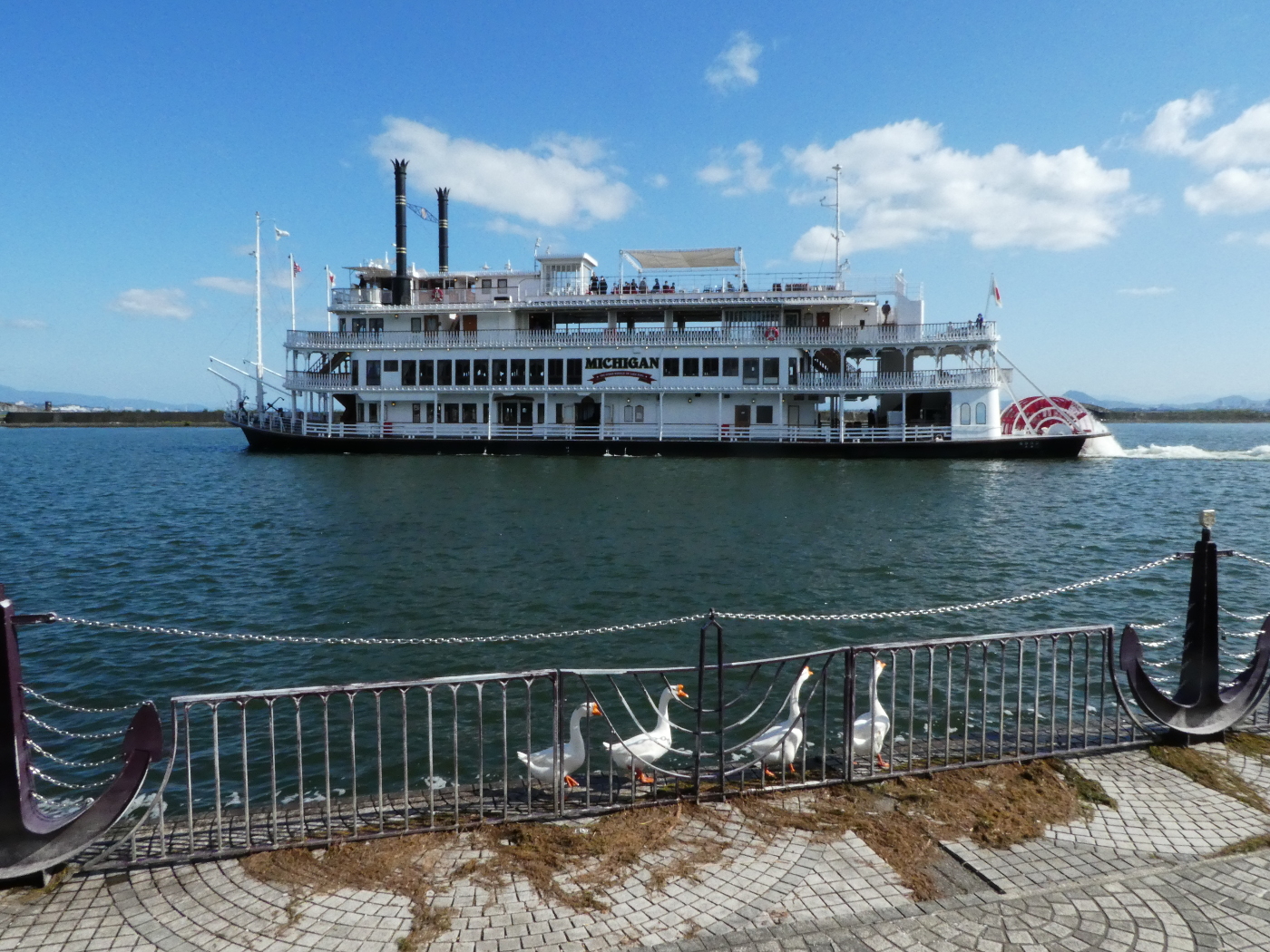 渡り鳥のシーズンには早いが、湖岸で見かける鳥たちを写真に撮るには日頃,見ている所為か余程、気が向かないとシャッターを押すことがない、今日も浜大津港では鵞鳥が騒がしく何事が起こっているのかと見ると四羽が並んで湖岸を歩いている姿の後方の湖上にはミシガン号が見え思わずシャッターを押した。鵞鳥に興味を持ったのは映画の題名からだ、今、京都で上映されている中国映画「鵞鳥湖の夜」が気になった。以前に見た、同じ監督の「薄氷の殺人」が凄くて、楽しくて、面白く、そして怖い映画だったと事を思い出した。そして鵞鳥を見ていると映画を見たくなった。打出浜ではカワウが大きな獲物を仕留め一気に鵜呑みしようと悪戦苦闘しているところに出くわした。常識的に見ても鵜の首よりも大きな魚を飲み込めるのかと心配しながら様子を見ると鵜の羽はずぶ濡れで直ぐに飛び立てないのではとおもった。立ち去ろうと鵜を見るとまだ魚と格闘?していた。そしてアオサギとシラサギがテリトリー争いで少し揉めていた。帰路浜大津の緑地帯で以前に見たチャガシラカラスは頭が黒くなっていた、相変わらず単独行動だ、でも元気な姿を見て少し僕は嬉しくなった。
