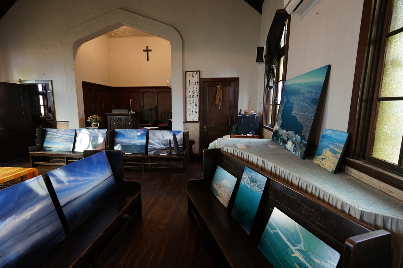 堅田教会創立九十周年記念の一つの行事として僕の写真展が開かれる事になった。その準備のために午後、三井寺の福家さんの車で向った。この度も三井寺さんの支援で写真展を開くことができると感謝した。堅田教会は建築家ヴォーリズが設計して1930年に設立された教会だ。90年の風雪に耐え今も凛とした姿を保つ美しい教会は今日も青空の下で創設当時を彷彿させてくれた。展示の準備のために信者さんが数名がお手伝いをしてくれた。壁がないので参列者の椅子を利用して写真を並べ簡単に展示は終わったのは福家さんの支持でテキパキと進んだからだと思った。写真展は明日12日(月)から17日(土)までと期間は短いが僕が堅田で写真展をするのは初めてだ。航空写真を主に50年の琵琶湖の変化を記録した写真を展示した。琵琶湖は今年も深呼吸できずに湖底は無酸素状態で生物に影響が出ていると新聞が伝えていた。僕の写真は総合開発が始まる前の琵琶湖の自然が残る姿を撮影したものから開発が進み人工化した琵琶湖までを撮った記録写真を見て琵琶湖に興味を持ってくれたら幸いとおもった。