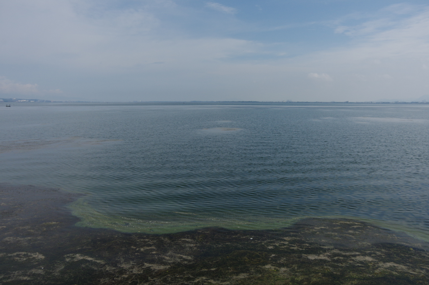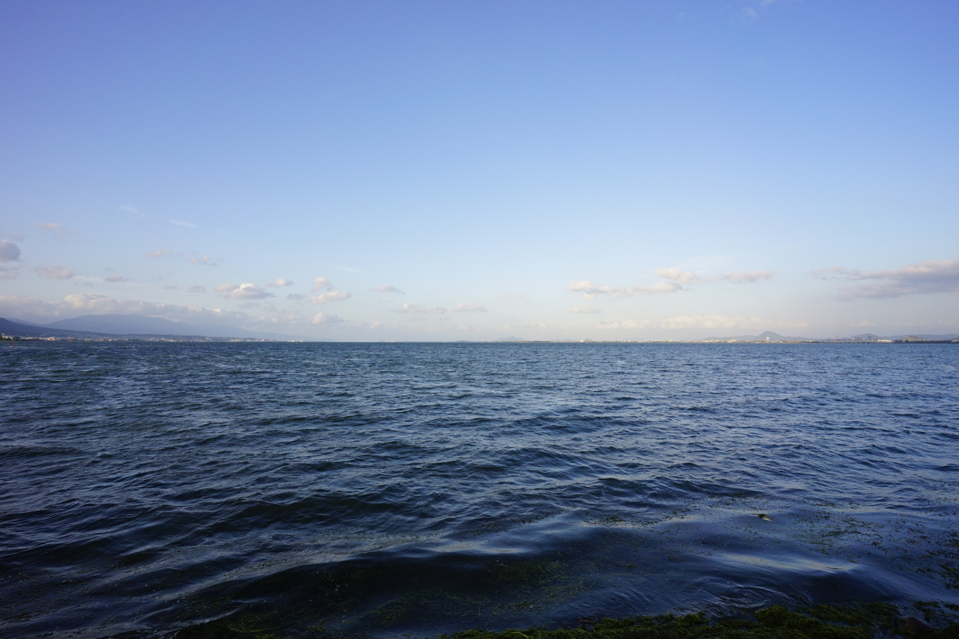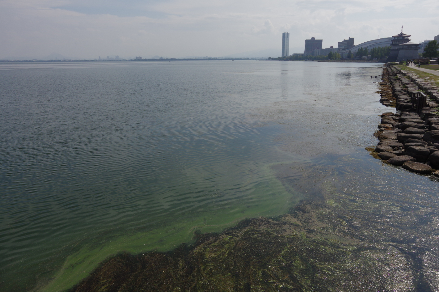 昨日に続き今日も浜大津湖岸ではアオコが見られた。今読んでいる「沈黙の春」ではDDTの空中散布が行われていた頃の時代を思い出した。大津は米軍が進駐してきた1945年からはアメリカの本国と同じように日本も相当量のDDTや危険な農薬が使用されたのではと小学生の頃の記憶を辿った。学校では女子児童にはシラミ検査が行われ、シラミが疑われる子にはDDTを頭に噴霧されている光景を思い出した。皆んなが見ている前で行われる噴霧作業は今なら大問題になったのではと占領下の一方的な衛生検査を受けざるを得なかった当時の教育制度の不備をおもいだした。1960年代でも大津市全体をヘリコプターで空から殺虫剤をスプレイしたことも記憶の中から浮かび上がった。最近では其のような光景は目にしなくなったが、今も農業で使用される農薬の基準もアメリカ並みに規制はゆるいと聞いているが除草剤は今も使用している農家が多いと聞いたこともあり不安が募るばかりだ。湖岸の緑地は幸いシルバーセンターとの契約で除草作業は手作業と草刈り機で行われているから今の処は大丈夫だ。湖岸のオオバナミズキンバイも手作業で除去作業が行われているからと少し安心した。でも本(沈黙の春)によると残留した化学物質も多くあると記してあった。以前、滋賀大学教授鈴木紀夫さんは湖底を無闇に掘り返さないほうが化学物質が水と混ざる危険度が少いと言われていたことを思い出した。そして湖面を見るとアオコの毒々しい緑色が気になった。本当に琵琶湖は大丈夫かと心配になってきた。
