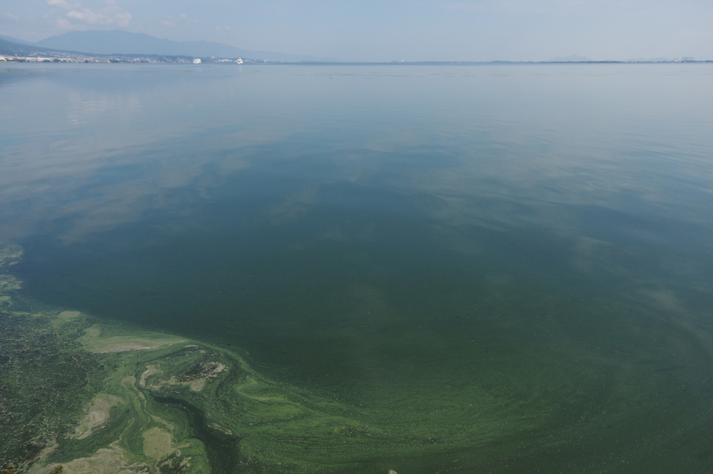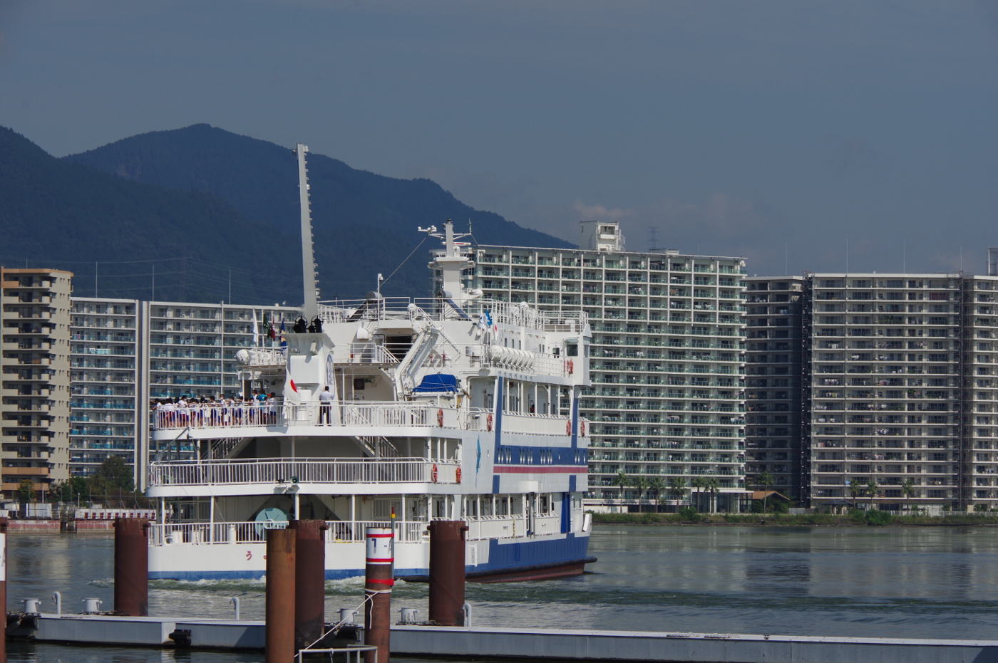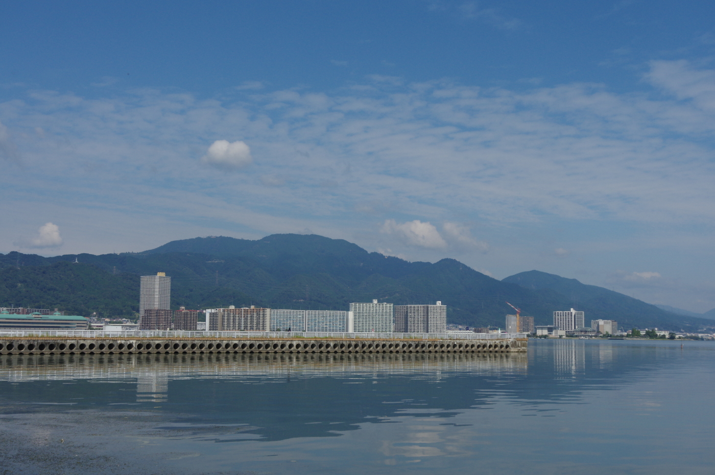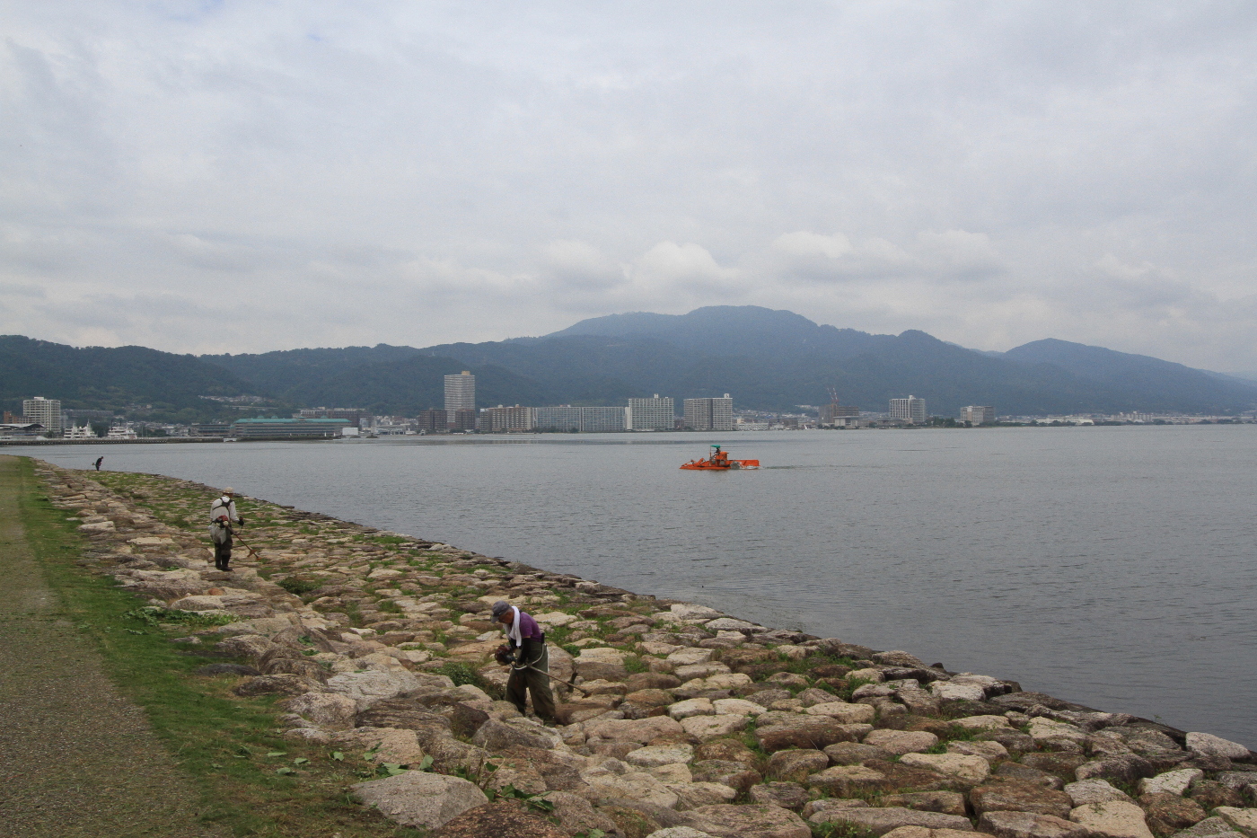 心配された、台風12号は進路を東寄りに変えた所為で滋賀県には影響がなさそうだ。湖岸ポタリングは今日も好天で青空には羊雲が見えた。そして台風が運んできた暑さで風も少し暖かく感じた。浜大津港ではミシガン号に続き学習船うみのこ、が出港、そして西大津のマンション群を背景に急旋回する姿には迫力を感じながら写真を撮った。内燃機関とシャフトで繋がれたスクリュウ時代と違いモーターで駆動するスクリュウは自由に角度が調整できるから急旋回も簡単に出来ると感心しながら学習船を見送った。そして長い突堤の見える湖岸へ移動した。突堤に設けられた丸い穴を見ていると琵琶湖の水位が低くなった事が一目瞭然だ。台風が来なければ1994年の琵琶湖大渇水の様にならなければよいがと心配になってきた。打出浜湖岸から見る湖面には少しアオコが見られ琵琶湖の水質が心配だ。湖上ではスーパーかいつむり号が除草作業をしているが水草は去年よりも少いのではと琵琶湖を眺めた。