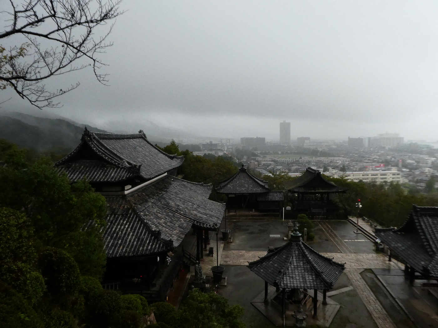 強い雨の中、何時もの散歩、三井寺へ向った。ビニール傘に当たる雨粒の音が心地よく聞こえ雨も又楽しいと歩いているとシャツが濡れているのに気づき、家に帰りゴアの雨具で再挑戦となった。三井寺の石段横の側溝の流れが早く、滝のように見え、改めて重力のパワーに驚いた。展望台から見る雨の眺めも格別と三井寺雨情を楽しんだ。