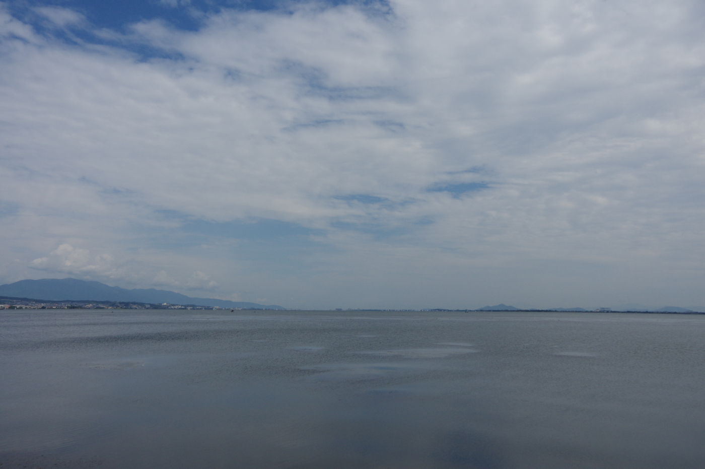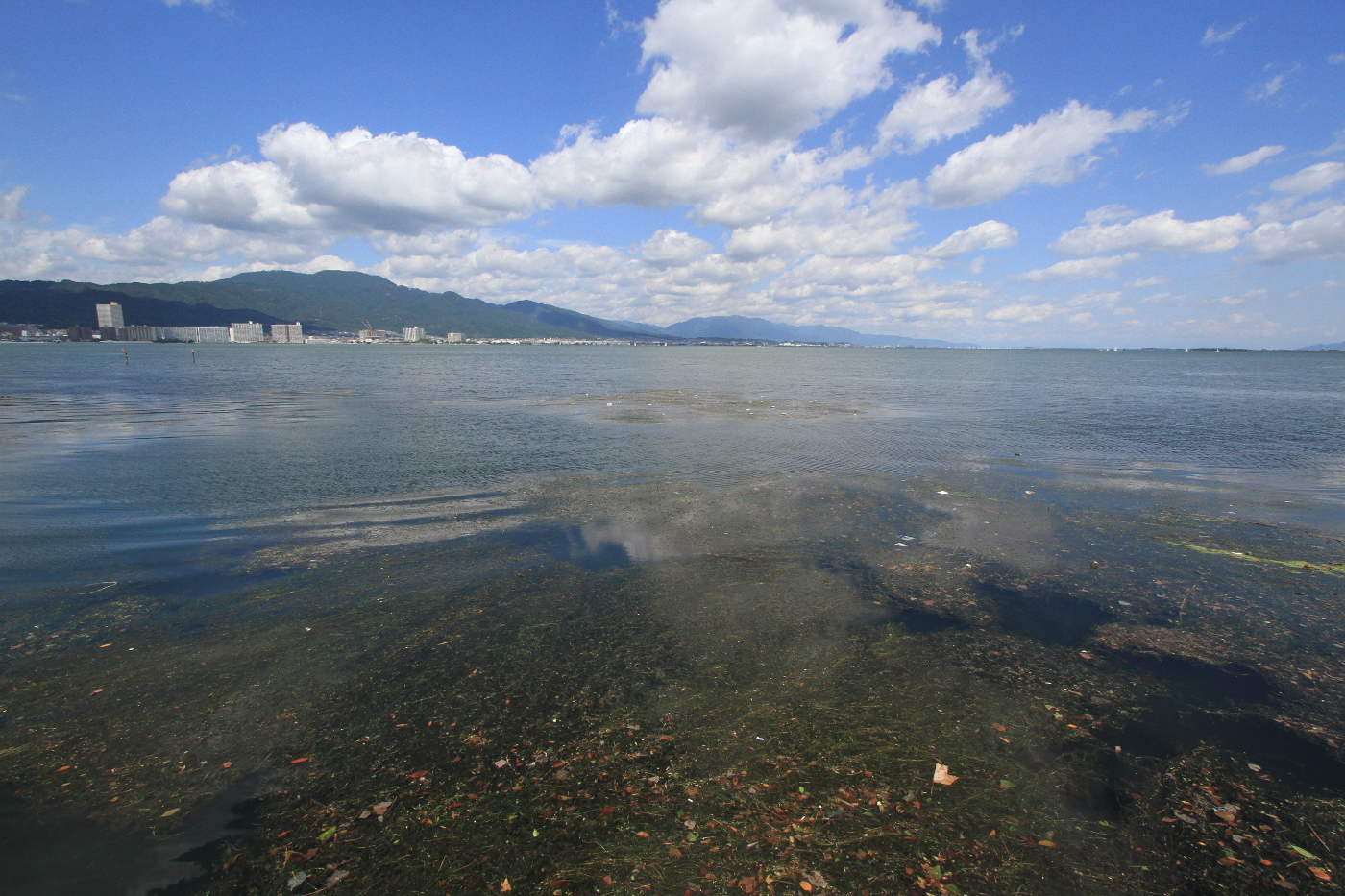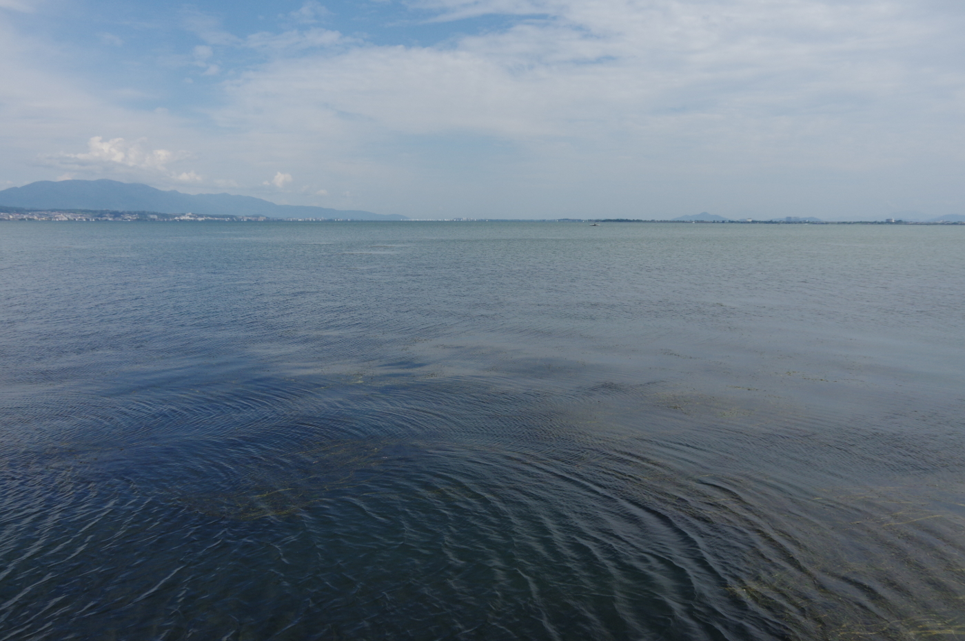 心配された、台風12号は進路を東寄りに変えた所為で滋賀県には影響がなさそうだ。湖岸ポタリングは今日も好天で青空には羊雲が見えた。そして台風が運んできた暑さで風も少し暖かく感じた。浜大津港ではミシガン号に続き学習船うみのこ、が出港、そして西大津のマンション群を背景に急旋回する姿には迫力を感じながら写真を撮った。内燃機関とシャフトで繋がれたスクリュウ時代と違いモーターで駆動するスクリュウは自由に角度が調整できるから急旋回も簡単に出来ると感心しながら学習船を見送った。そして長い突堤の見える湖岸へ移動した。突堤に設けられた丸い穴を見ていると琵琶湖の水位が低くなった事が一目瞭然だ。台風が来なければ1994年の琵琶湖大渇水の様にならなければよいがと心配になってきた。打出浜湖岸から見る湖面には少しアオコが見られ琵琶湖の水質が心配だ。湖上ではスーパーかいつむり号が除草作業をしているが水草は去年よりも少いのではと琵琶湖を眺めた。