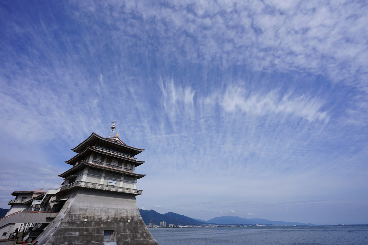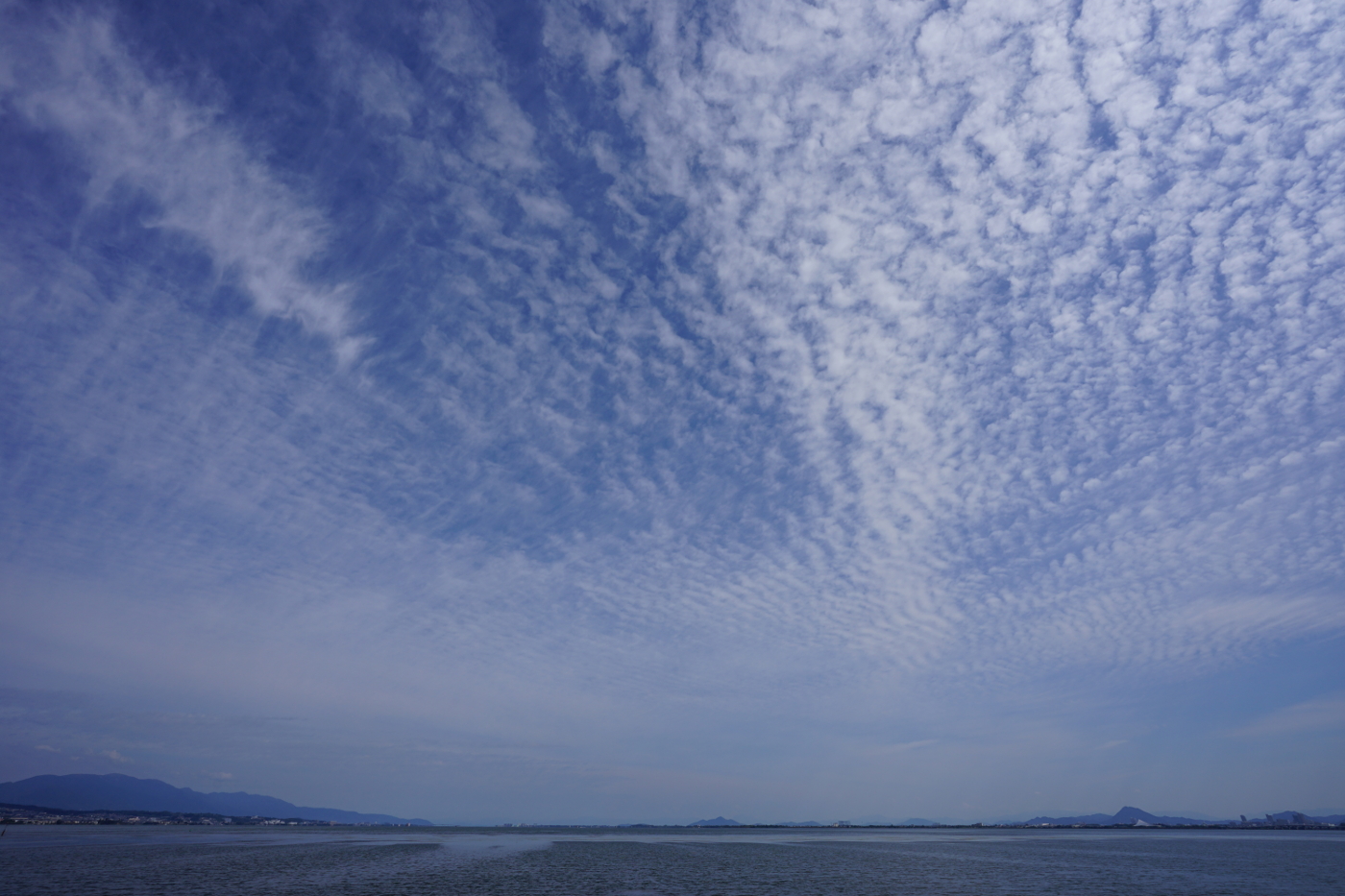 毎日にの散歩の楽しみは雲を見るのが一番だ。今日も空を見上げると巻積雲、巻層雲の鱗雲や水まさ雲(空の名前・高橋健司で確認)が見え、見晴らしの良い三井寺の展望台へ急いだ。遮るもののない展望台から空を眺め日本近海の台風のお陰で最高の空の美術館日和となったと感謝した。今日は福島の友人に貰った超広角レンズが出番だ。雲の動きは早く高高度では風が強いのかと思いながらシャッターを押し数枚撮ってスクリーンで確認すると太陽光線の影響を受けて空の色が緑、紫に影響されて不思議な写真になるが面白いと思った。散歩から帰ると直ぐに自転車を出して湖岸へ向かうと、青空が一段と映え雲は高積雲の鯖雲や羊雲が大空のキャンパスに超巨大な作品を見せてくれた。浜大津湖岸も打出浜湖岸も遮るものは無く空の美術館を心ゆくまで楽しめ、写真を撮るにも最高の場所だ。高高度の雲は僕の操縦できる小型機のセスナやパイパー機では到達できる高度ではなく鰯雲や羊雲に一度も近づき遊んでもらったことがない畏敬を感じる偉大な雲に暫し見とれた。湖岸から撮る雲は角度が浅く太陽光の影響をもろに受けないのかデジカメのスクリーンで写真を確認しても綺麗に映っていた。デジカメを終い大空の美術館を楽しんだ。