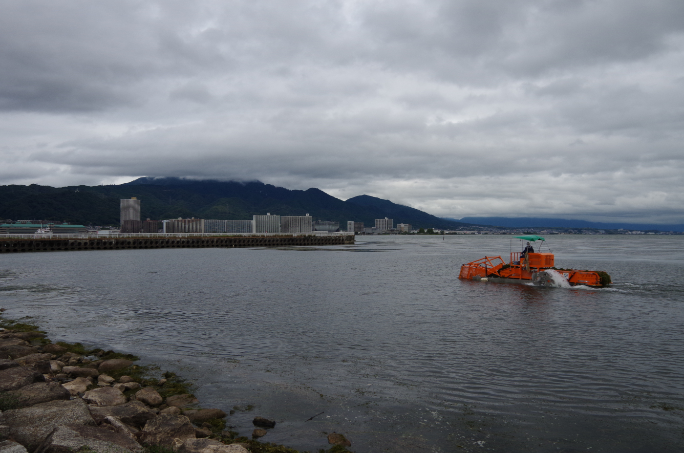 昨夜来の雨で琵琶湖の水位は少しは上がったかと思いながら湖岸へ出かけた。浜大津湖岸から清々しい雨後の琵琶湖を眺めると彼方の琵琶湖大橋は下位蜃気楼が出ている風景を久しぶりに望遠レンズで撮った。近くの湖面では今日もスーパーかいつぶりW号そして打出浜ではスーパーかいつぶりV号が藻の除去作業を行っていた。琵琶湖の自然景観を人間の好みにするためには相当な費用がかかるのではとおもった。僕は自然は美しいも怖いものだとおもっているから藻が多く見える湖面もアオコや淡水赤潮の湖面も琵琶湖からのメッセージなのだと・・・