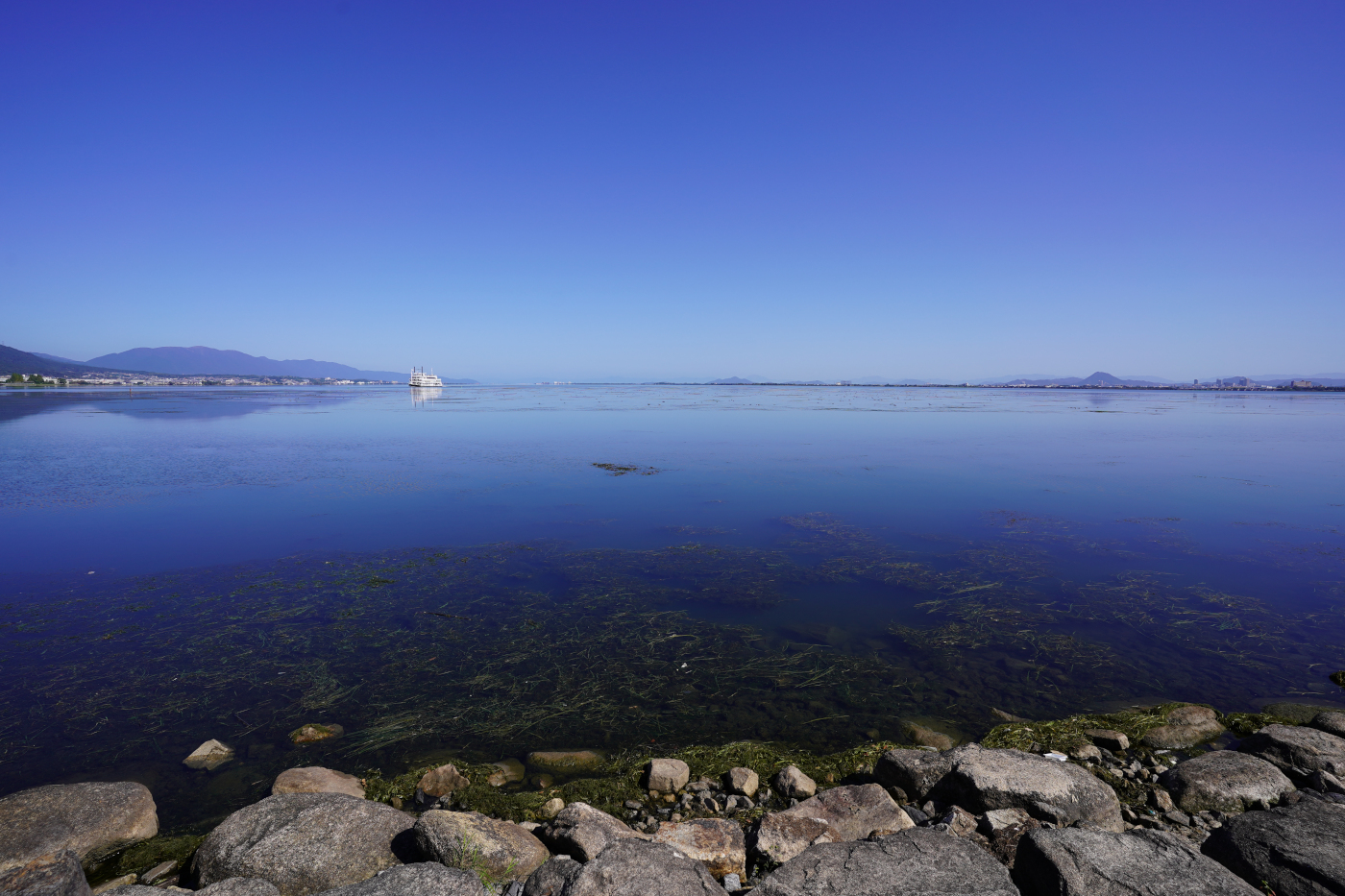 写真は浜大津湖岸から打出浜湖岸の湖面はスーパーかいつぶり号の活躍で藻が少なくなった。