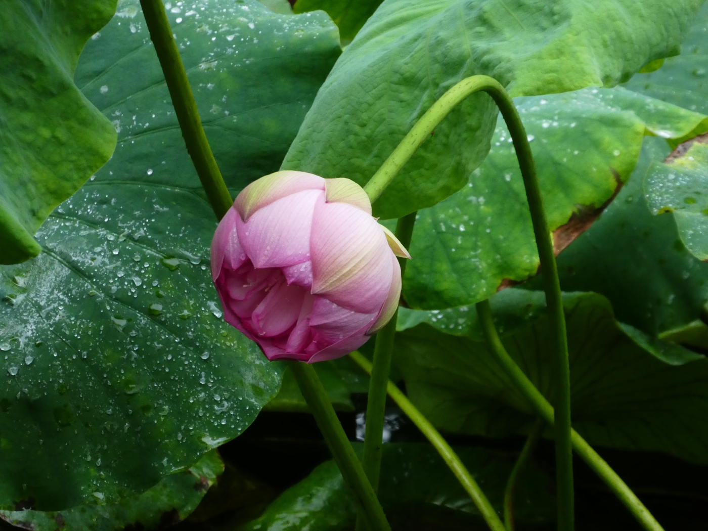 三井寺の蓮池の花は今年は茎が弱いのか花が重いのか、垂れてしまって水に浸かってしまう花も多く残念だ。長雨の所為ではと考えた。