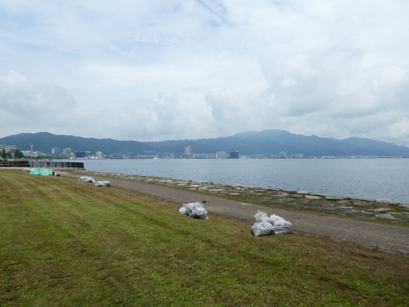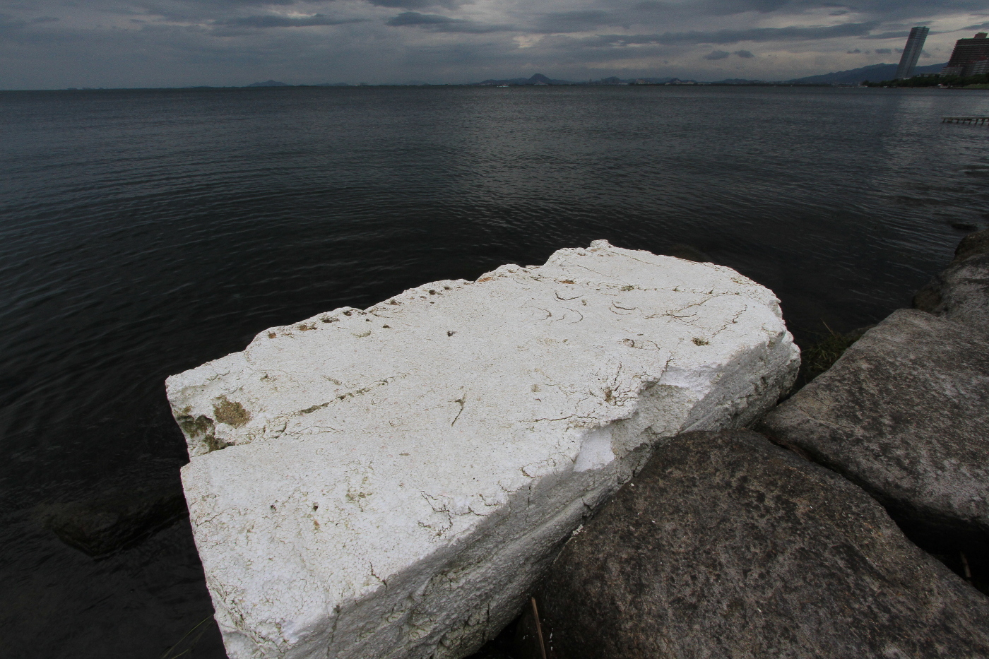 超広角レンズで撮った湖岸風景は氷山が漂着したようにも見える?もちろん琵琶湖に氷山など在るはずがない・・・今日、湖岸ポタリングで浜大津湖岸に来てみると白い大きな発泡スチロールの塊が漂着していた。漁業らで使用されるものではと思った。近づいてデジカメを構えると氷山の様にも見えるプラスチックのゴミを見ているとスエーデンの少女グレタ・トゥーンベリさんの環境運動を思い出した。世界中は今、新型コロナウイルス禍で大騒ぎしていて原発、プラスチック海洋汚染、核兵器、紛争問題そして差別問題らは語られずニュースにも上がってこないと思いながら大きな発泡スチロールを写真に撮った。ポリ袋は最近有料化されたり薬局などでは廃止されたがプラスチックゴミとしては一部のことではと思った。そして足下の環境問題を考えると自分の生き方が恥ずかしくなった、というのは、毎日、飲むワインの瓶も燃えないゴミとして出される、そしてペットポトルの水を飲む、エアコンを使用する暮らしらを考えても環境に大きな負荷を掛けながら生活しているホモ・サピエンスの社会だ。コロナ禍の中で多くの事を学ばねばホモ・サピエンスは終末の時を迎えるのではと思いながら暮らしの矛盾を思い返した。