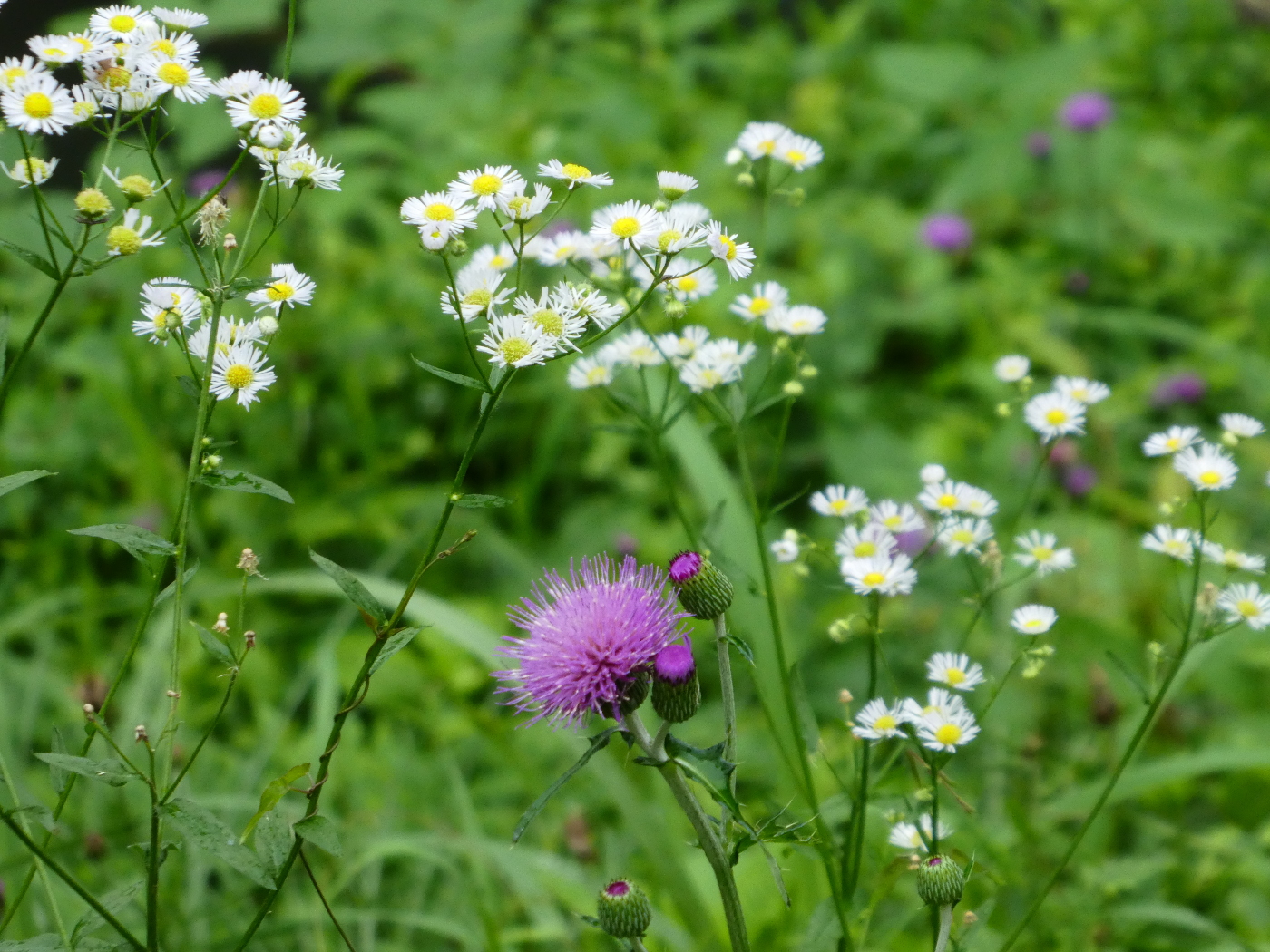 雨が降ろうと槍が降ろと・・そんな気持ちで毎日の三井寺への散歩は続けているのは何故と思いながら今日も出かけた。鹿関橋から疎水の堰堤を見ると鮮やかなアザミの花が目に入った。二月ほど前に除草作業で刈り取られたのに堰堤の植物たちは見事に蘇った。ニンゲン目線では雑草?が覆ったというが、その姿を見て驚くべき植物のパワーを感じた。柵越しにアザミとヒメジョオンの花の共演を写真に撮った。植物と動物の細胞は基本的には余り変わらないといと言われているが植物は光合成で太陽のエネルギー?だけで成長する、動物、我らニンゲンは食物(資源)を取り込まねば生命を維持できないのは欠陥品ではとデジカメを持つ手を見つめた。ニンゲン一人37兆個の細胞がそれぞれ組み込まれた遺伝子で役割が決まっていると聞くが地球上で資源を一番浪費するニンゲンの役割は何なのかと、新型コロナウイルス禍で狼狽えてばかりいては万物の霊長類トップを自認するニンゲンは恥ずかしくないのだろうかと堰堤の活力ある植物群を見て感心するしかなかった。