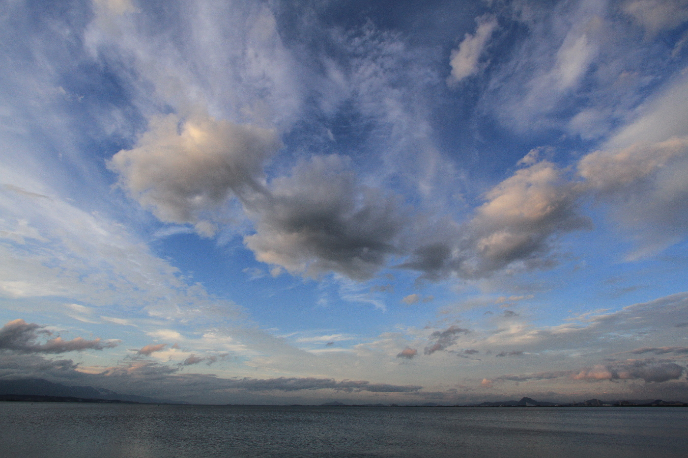 梅雨前線が南に下がったとテレビの天気予報が伝えていた。夕食後、二階の窓から東方を見ると美しい雲が見えた。体は気だるさを感じるが雲が誘ってくれては断れないとデジイチを持って湖岸へ向かった。浜大津港から比叡山を見ると山頂は水分を多く含んだ積雲に覆われている、その雲は北へ進んでいた。上空には巻雲も見られ青空が眩しく見えた。大気の流れの不思議さを感じながら久しぶりに空の美術館で雲の作品を楽しんだ。そして美しい空を見ながら自然の不条理さも同時に感じた。九州地方や広島、長野と広い範囲に渡って大きな被害をもたらした梅雨前線は今週末にも北上すると天気予報が伝えている被災地の皆様のご無事を祈りながら前線の活動が弱まることを願うしか無いと赤く染まりかけた空を見た。そして政府が行うGO TOキャンペーンに使う予算を被災地支援にまわしてほしいとおもった。コロナの第二波が心配される中、遠くへ行かずとも近くでの楽しみ方があるのではと思いながら空を見た。僕は遠くへ行かず湖岸から琵琶湖と空を見るだけと・・・・