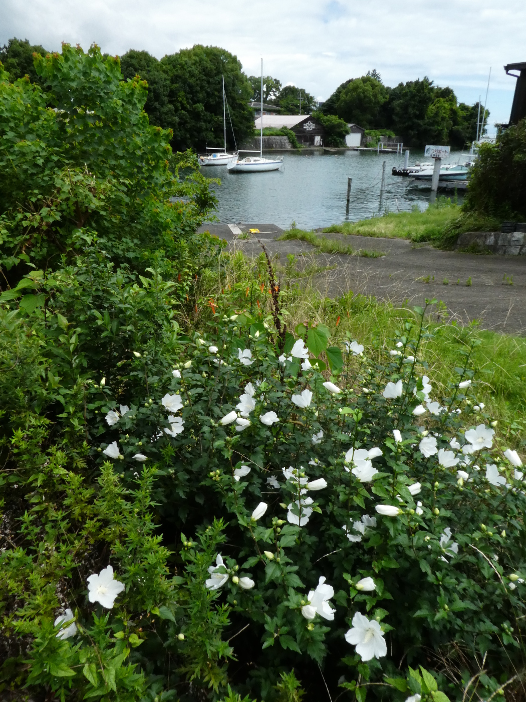 写真二枚目、疎水河口では白いムクゲが咲いていた。
