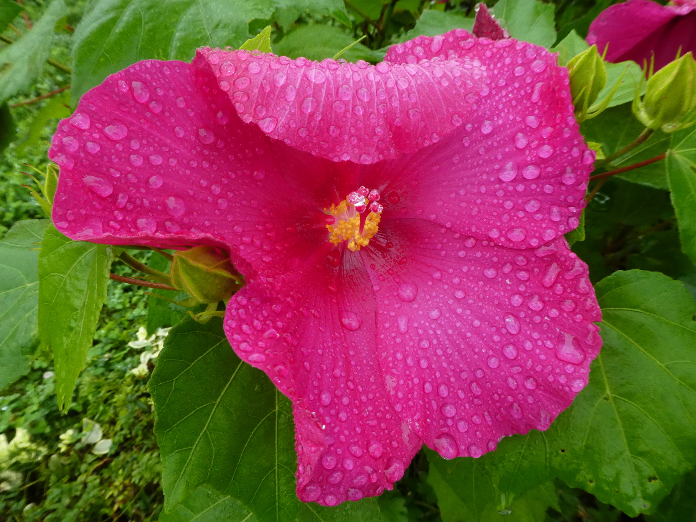 今日は検診日で坂本のKクリニックへ出かけた。良いお天気なら自転車で・・残念ながら雨・・京阪石坂線で三井寺駅から比叡山坂本駅15分足らずで到着した。小雨の中を歩いて向かう途中で雨に濡れた大きな花を横目で眺め数歩通り過ぎた辺りで網膜に映る赤い花と水滴がストップモーションを掛けた様に僕の脳内スクリーンに固定された。足を留め花の咲いている場所に戻った。改めて実物の赤い花(芙蓉の花?ムクゲ?)は美しい水滴を纏っていた。僕はこんなに美しい花を見たことはないと思いながらデジカメのシャッターを押した。モニターに映る赤い花を見ていると何故か、再読している「地球幼年期の終わり」の中に出てくる、超知性体で地球総督のカレレンの正体はと想像した。宇宙空間を旅する飛行体にそれほど多くの食料など積む事は不可能ではと、もしか超知性体のカレレンは植物と動物を合わせ持った生命体ではと・・光合成で植物のように生命を維持すれば水と太陽光?そして炭酸ガス、酸素らだけで宇宙空間を移動できる体を想像した。でも小説の中での正体は明かされていて小型恐竜を想像させてくれるが、それなば僕は河童と鬼を合体させた植物と動物の中間的な姿を想像した。そして気がつくと大宮川の近くを歩いていた、Kクリニックはもう直ぐだ。水滴を着けた美しい赤い花は超知性体ではと白中夢から醒めた。