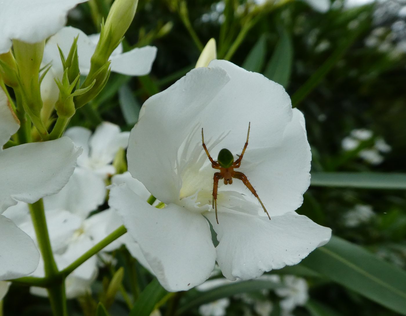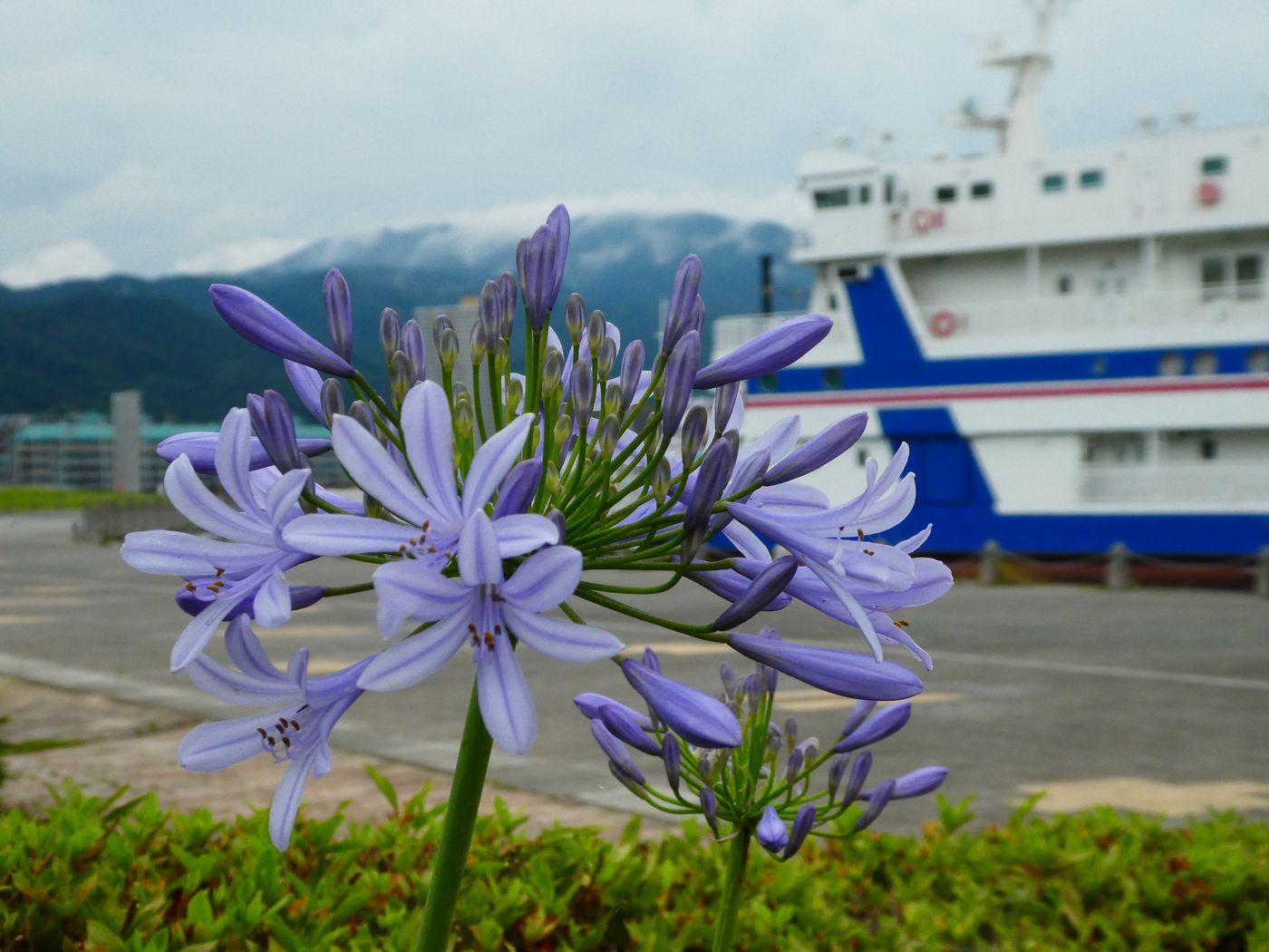 逞しい植物と言えばタンポポやど根性ダイコンらの映像がテレビで紹介される事は良くあるがと今朝の散歩で鹿関橋近くの電柱の傍らで咲くパンジーの花を見つけた。本来なら可憐な花の逞しさをニュースにしても良いのではと思いながら写真に撮った。そして植物の生命力の強さには驚くばかりだ。人類が滅んでも地球は大丈夫だと思った。三井寺の境内では夾竹桃が白い花を咲かせている、夾竹桃は毒性植物として有名だ。近付いて花を見ると白い花の中に蜘蛛がいるのが見えた、でも花にも毒性があり近付く昆虫はいないのではと、そして蜘蛛なら糸を使い蜘蛛の巣を作れば良いのにと,態々毒のある花の中にいるのかとデジカメのモニタに写る蜘蛛の足を確認、6本あった、コオロギではなく蜘蛛だ。浜大津港では夏の花、アガパンサスが咲いていた。この花もアフリカ原産で外来種だ。我が家にも根を張って勢力を伸ばしているが先日、花の咲く前に多くの葉を剪定してしまった。少し反省しながら青く清清しい花に詫びた。