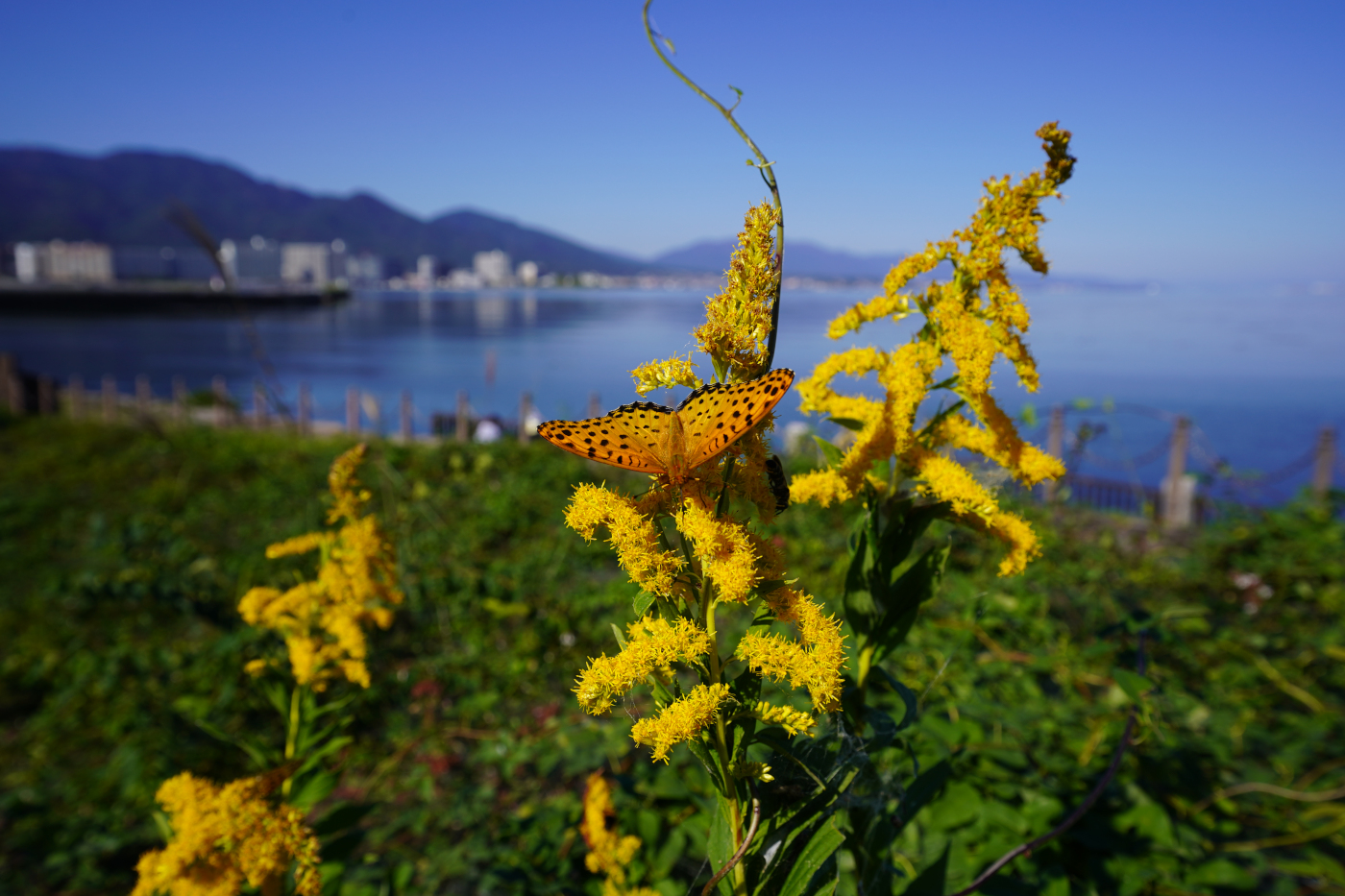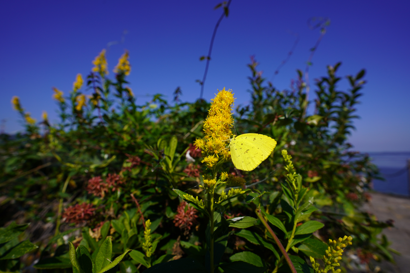 今日も湖岸ポタリングでは浜大津湖岸の吾妻川橋の近くに咲いているセイタカアワダチソウを見ていると小さな黄色の蝶が蜜を探して花の周りを飛んでいるのに気づきデジカメで撮った。昆虫の撮影は待つのが一番とか聞いたことが?あり暫く待っていると花の近くに飛んでくるから不思議だ。黄色の花よりも赤い花だったら黄色の蝶と合うのにと思うのは人間のエゴイズムだ、と思った。黄色の蝶はグウぐるレンズでキタキチョウと分かった。此の蝶は成虫のまま越冬すると記してあった。そして越冬できずに消えるウスバキトンボの事を思い出し少しトンボを気の毒に思った。そして浜大津港の湖面では少しアオコが見られた。琵琶湖は去年に続いて渇水となった。台風が来ない秋になったのかと青空を見上げた。