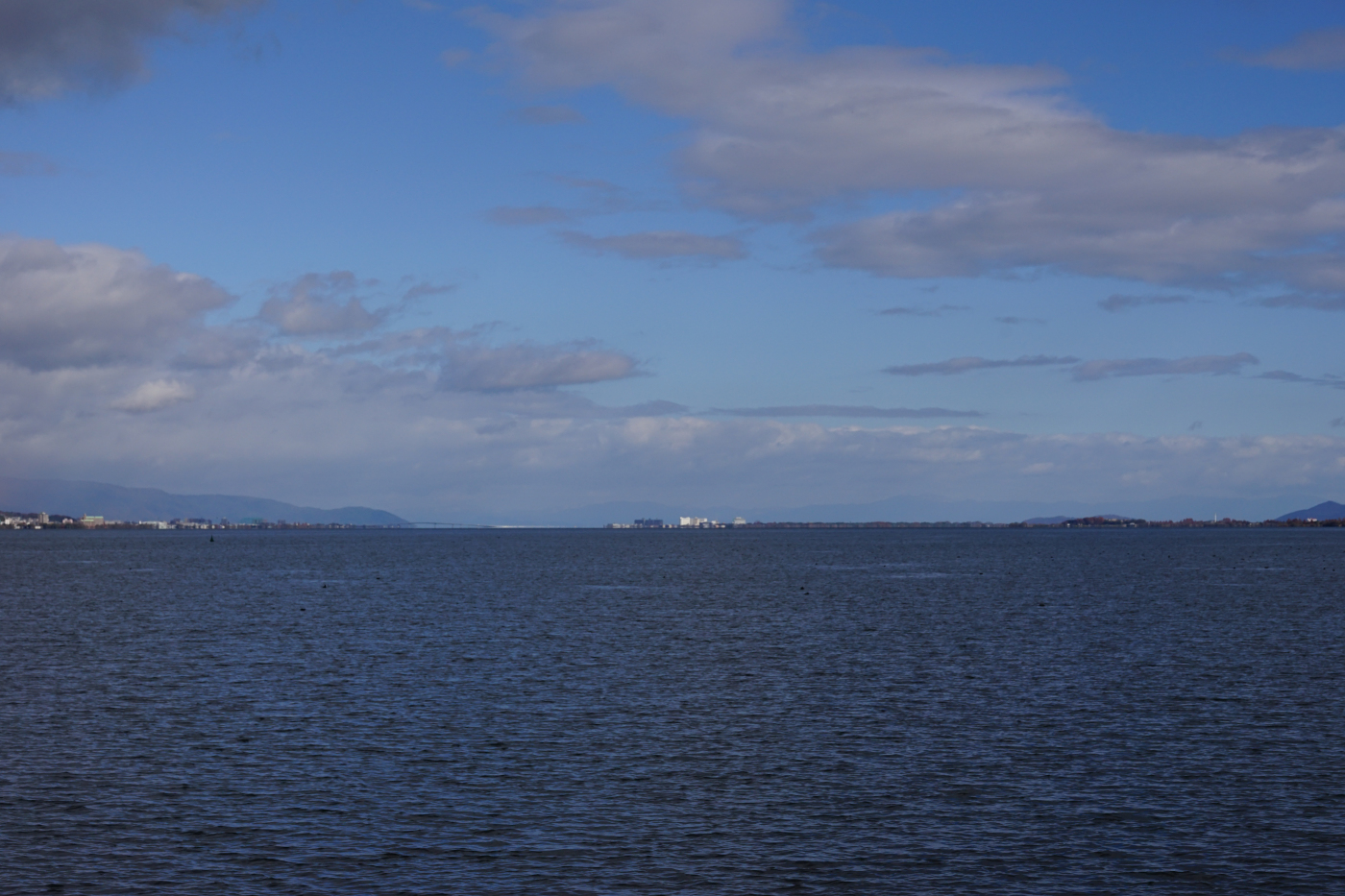 最近は虹を見る機会が少なく今年は虹の写真が撮れていないから年賀状の写真が無く困っているところだ。今日の湖岸は時雨そうなので虹を期待するも見ることが出来なかった。でも午後三時を過ぎた頃に湖岸へ向かうと大きな積雲が湖上に浮かんでいる素晴らしい風景が見られた。雲は低く蓬莱山の標高1,174メートルより少し低い高度で西から東へと湖を横切っている大きな雲を見ていると飛行機に乗って雲に近づきたい気分になった。よく見ると東に行くほど高度が低くなっているから2000フィート位(600メートル)かと考えながらデジカメのシャッターを押した。